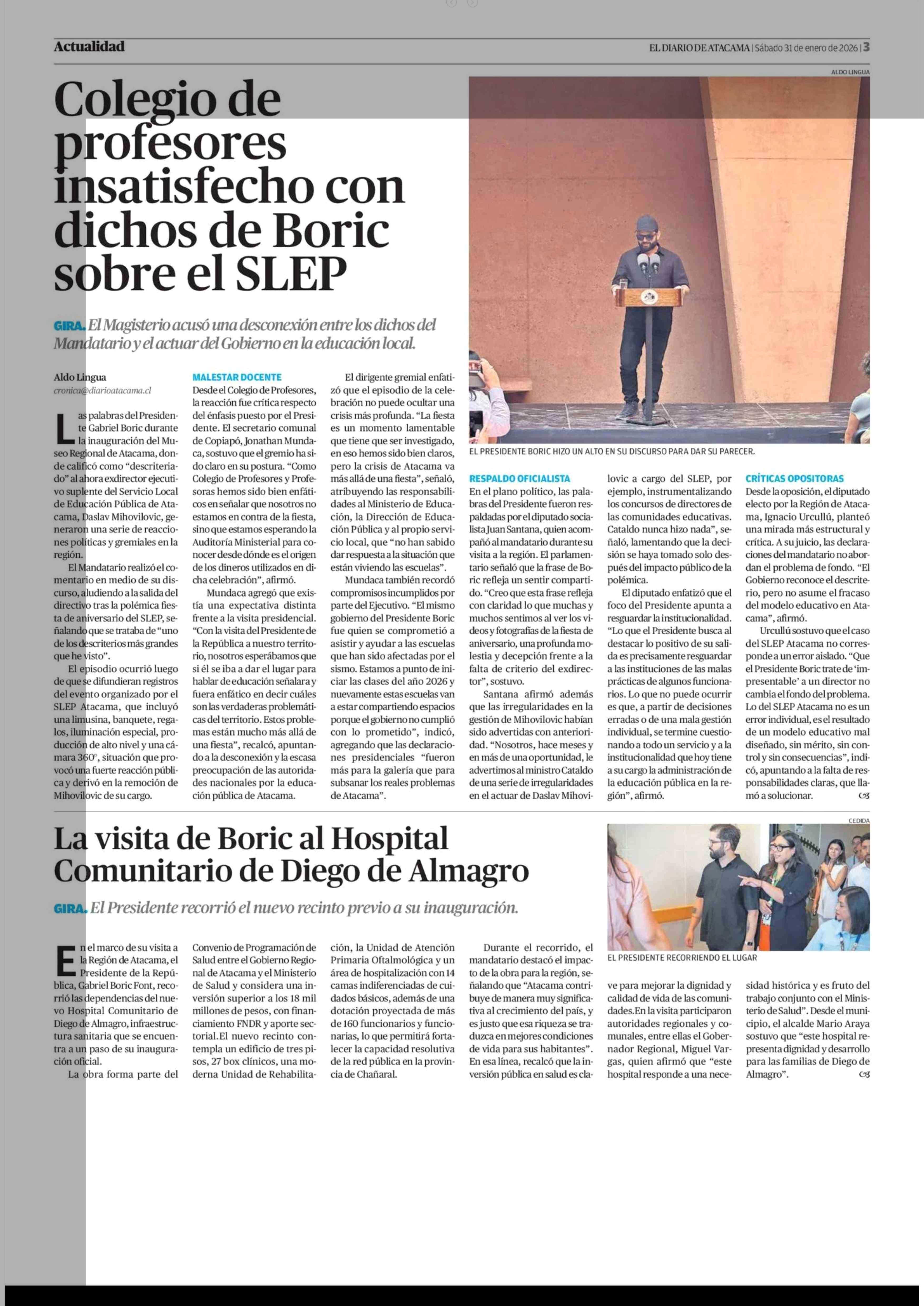 Colegio de profesores insatisfecho con dichos de Boric sobre el SLEP 31-01-2026 El Diario de Atacama |