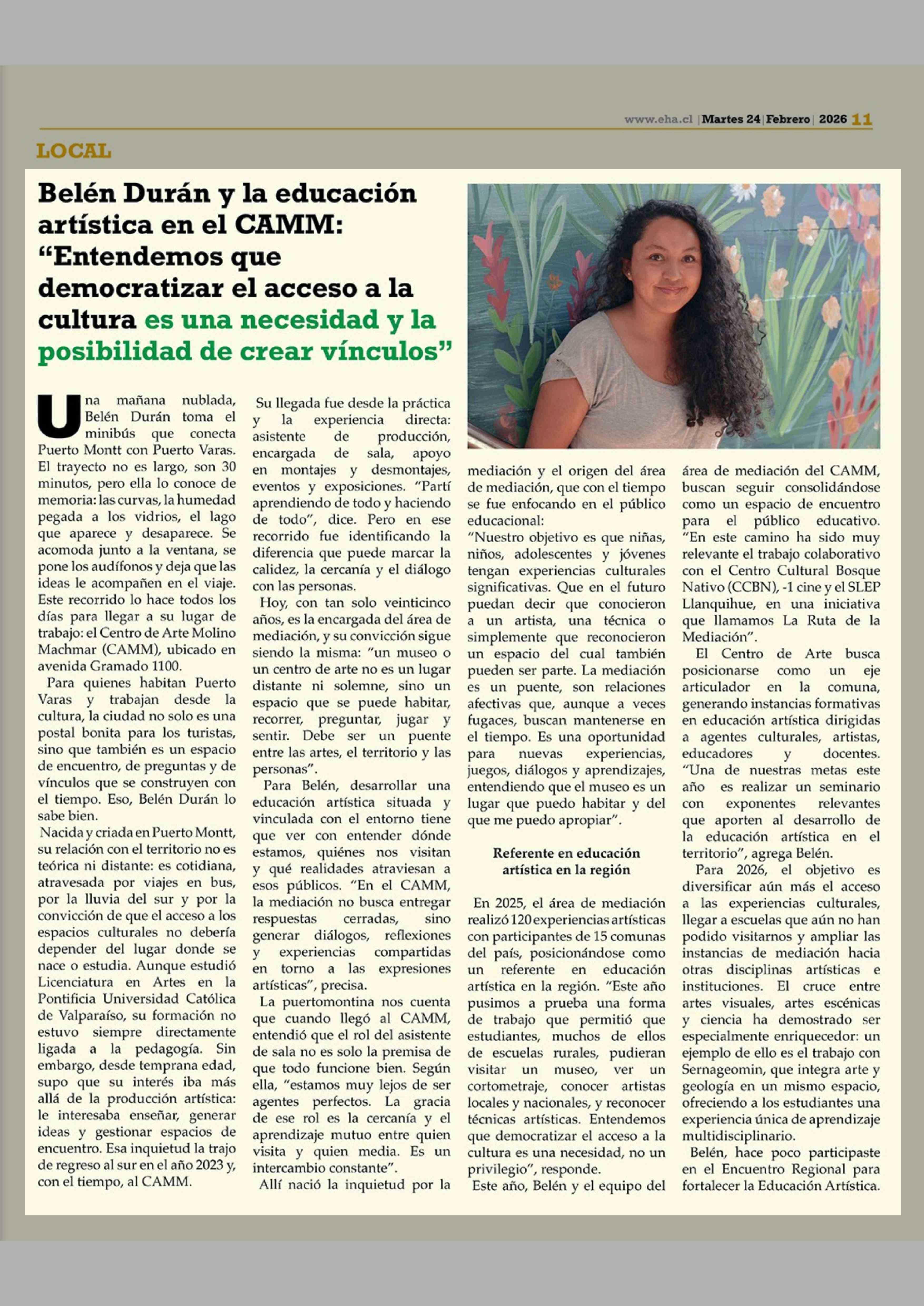 Belén Durán y la educación artística en el CAMM: "Entendemos que democratizar el acceso a la cultura es una necesidad y la posibilidad de crear vínculos" 24-02-2026 El Heraldo Austral |