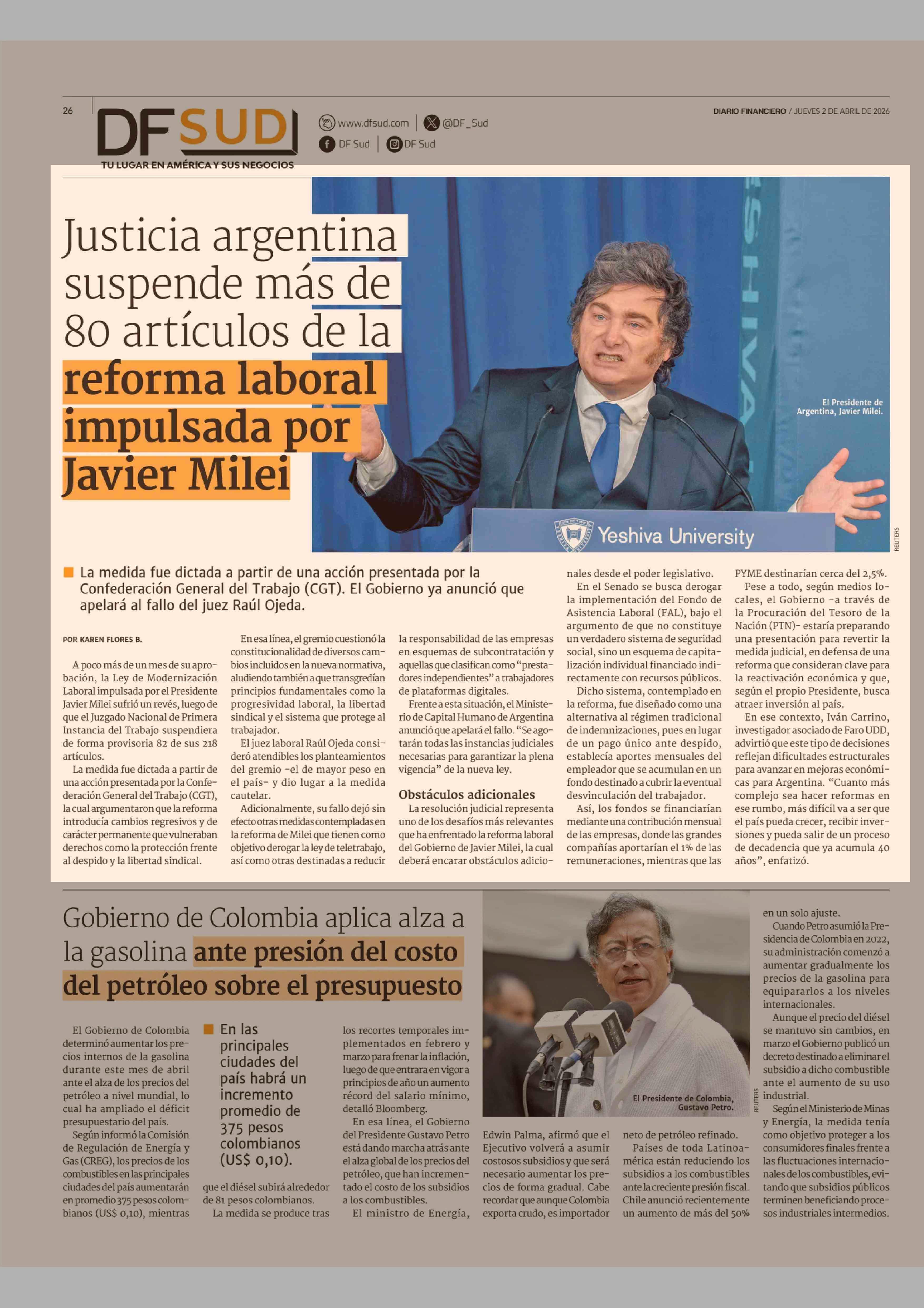 Justicia argentina suspende más de 80 artículos de la reforma laboral impulsada por Javier Milei 02-04-2026 Diario Financiero |