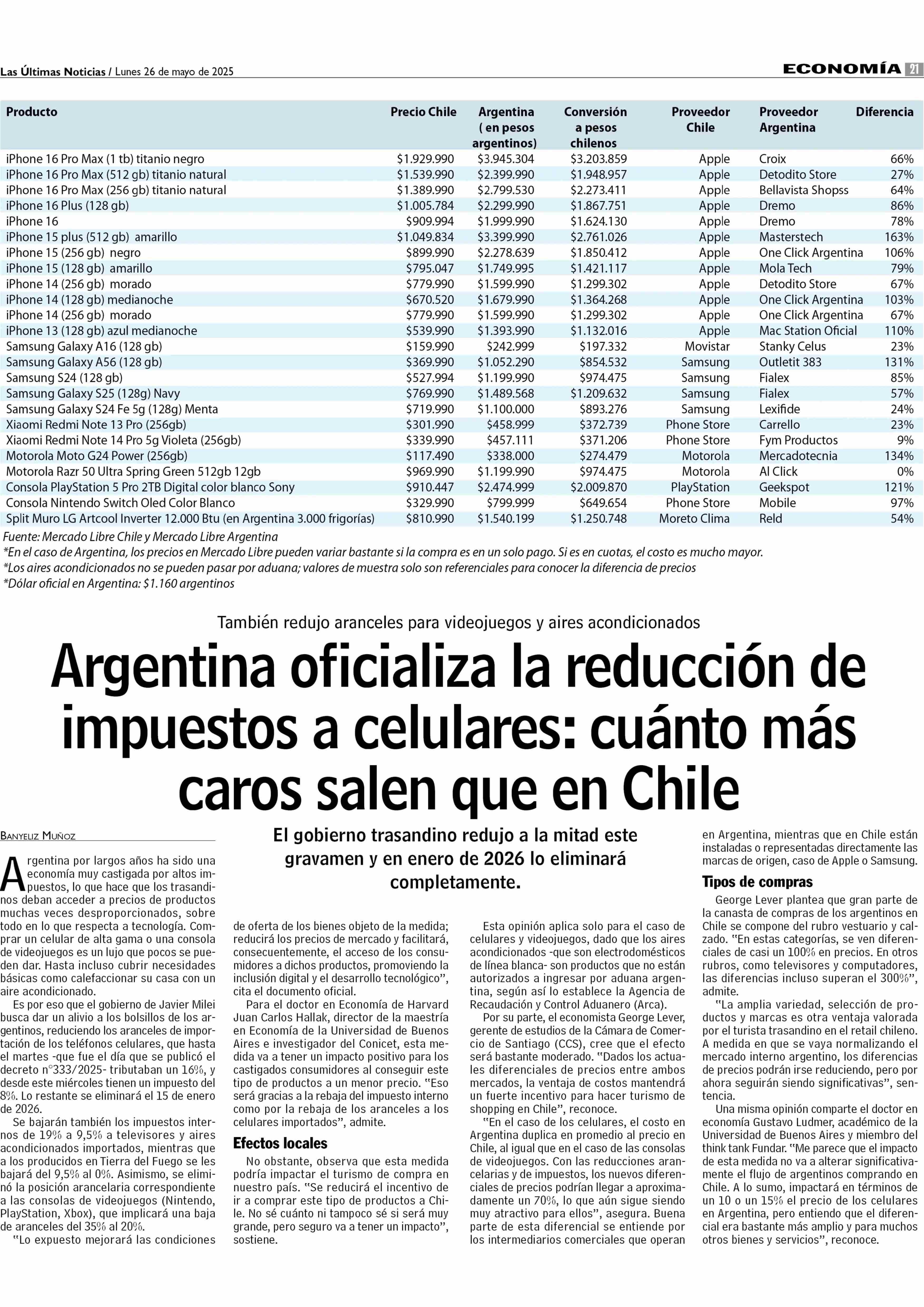 Argentina oficializa la reducción de impuestos a celulares: cuánto más caros salen que en Chile 26-05-2025 Las Últimas Noticias |