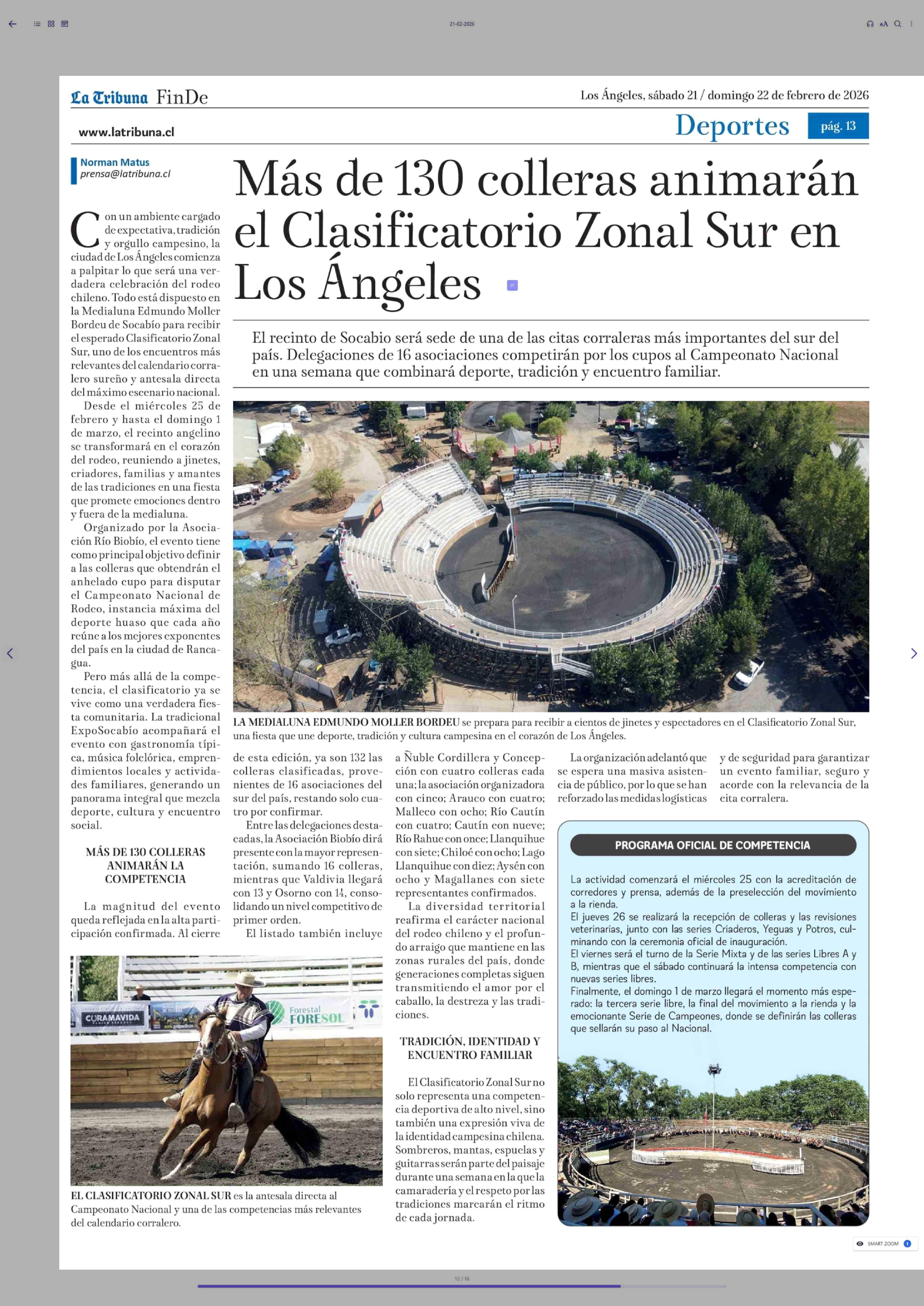 Más de 130 colleras animarán el Clasificatorio Zonal Sur en Los Ángeles 21-02-2026 La Tribuna |
