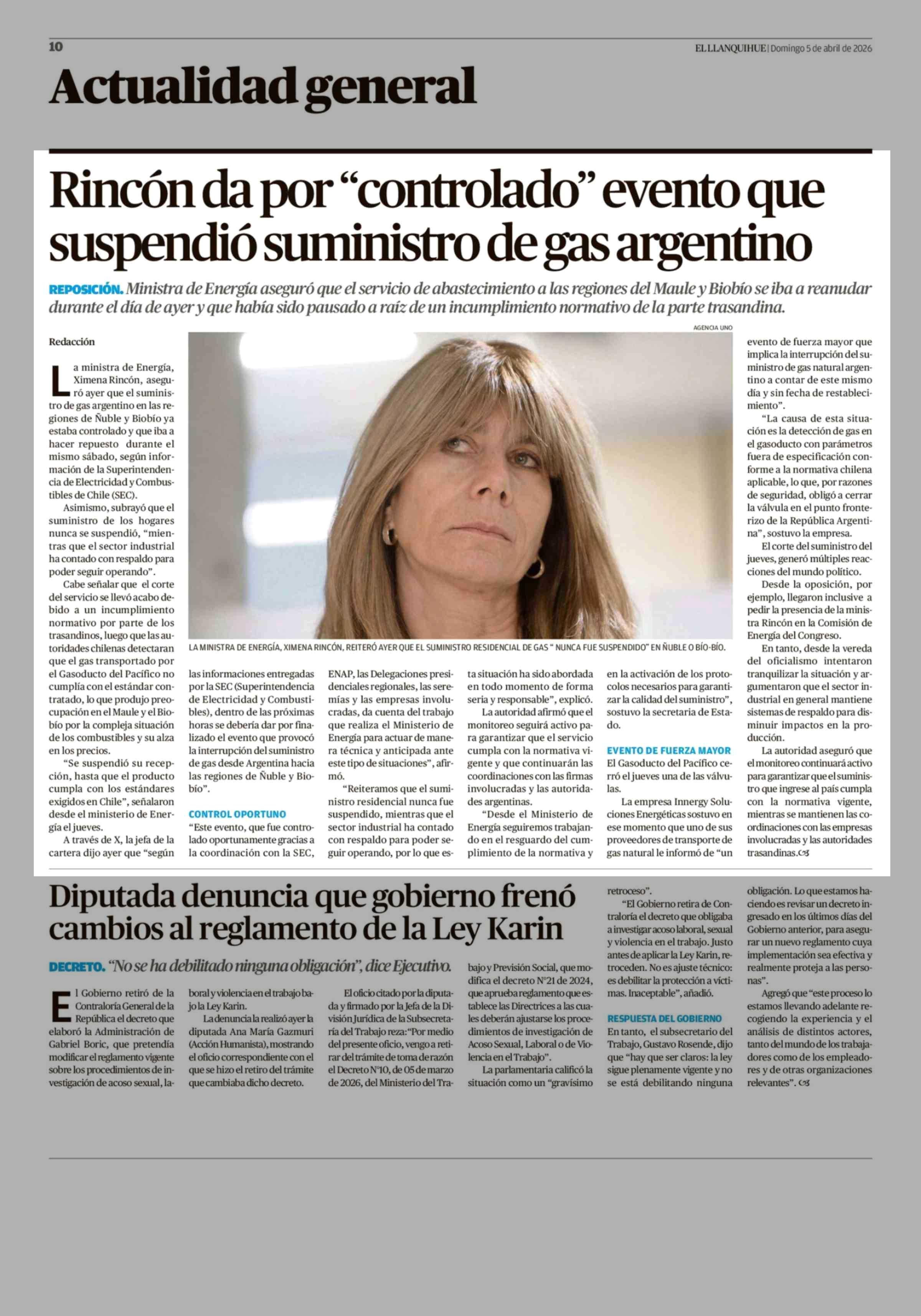 Rincón da por "controlado" evento que suspendió suministro de gas argentino 05-04-2026 El Llanquihue |
