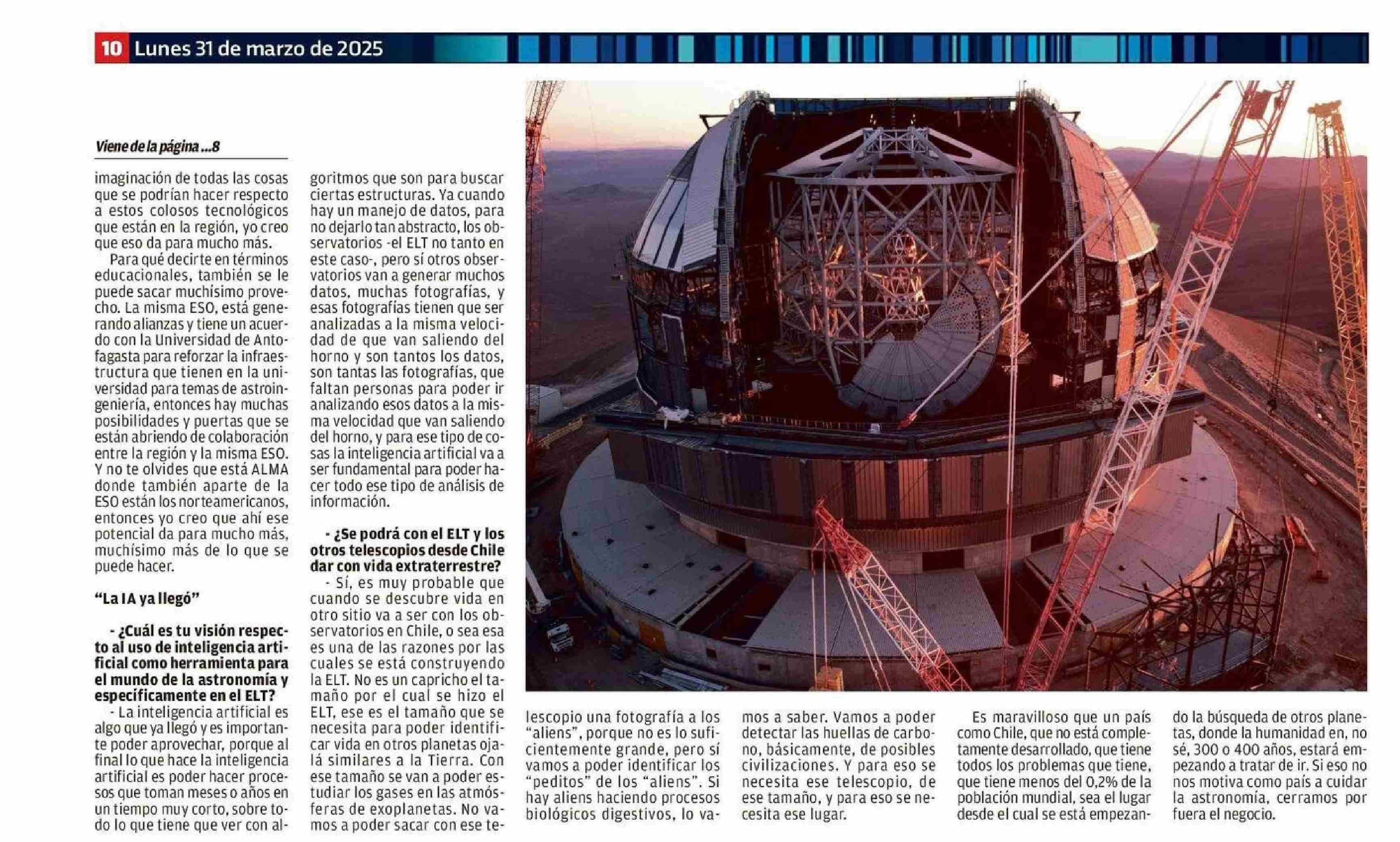 Luis Chavarría, astrónomo, y construcción del telescopio ELT: “Esta es una gran oportunidad para incentivar el astroturismo” 31-03-2025 El Llanquihue |