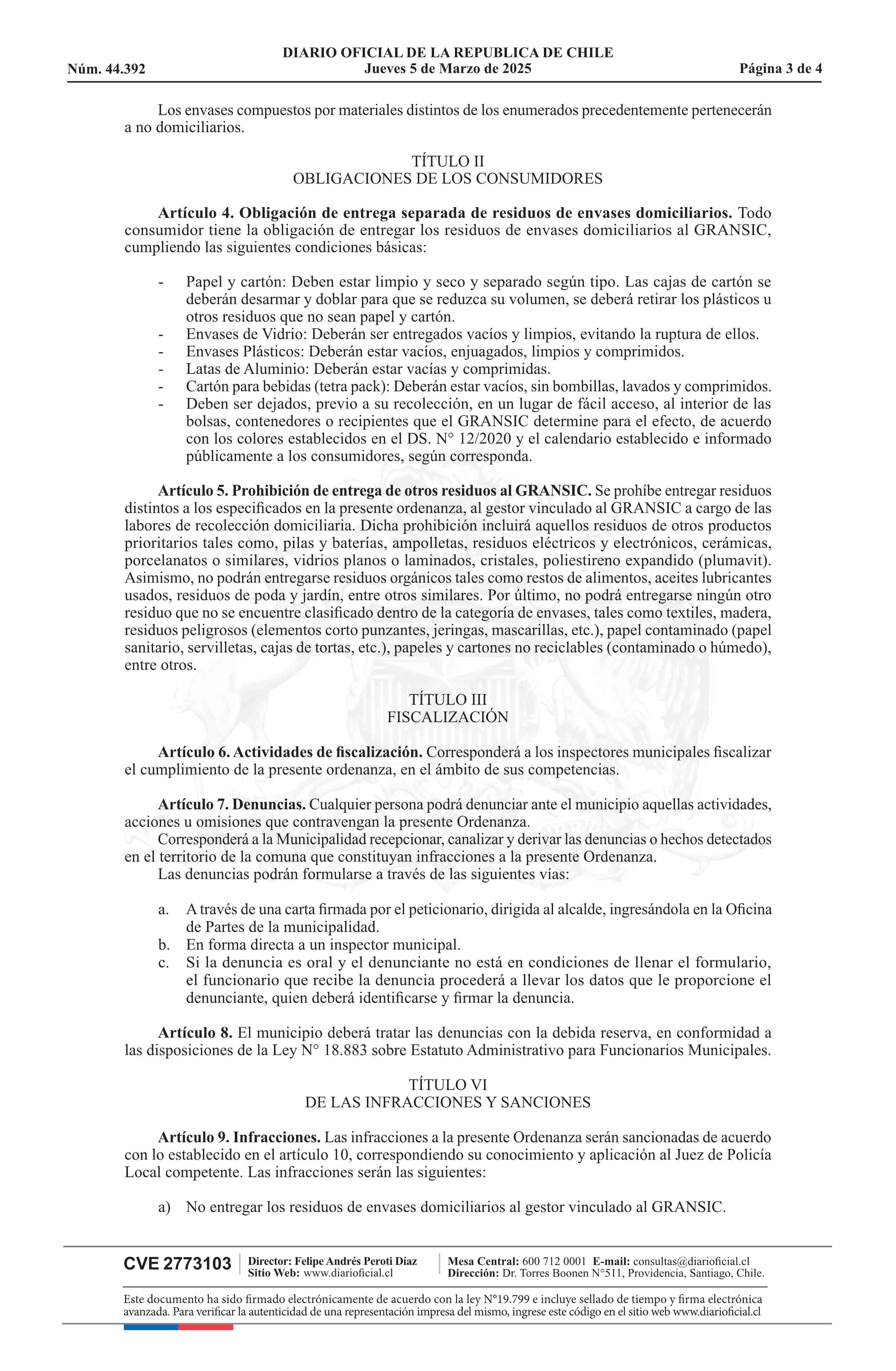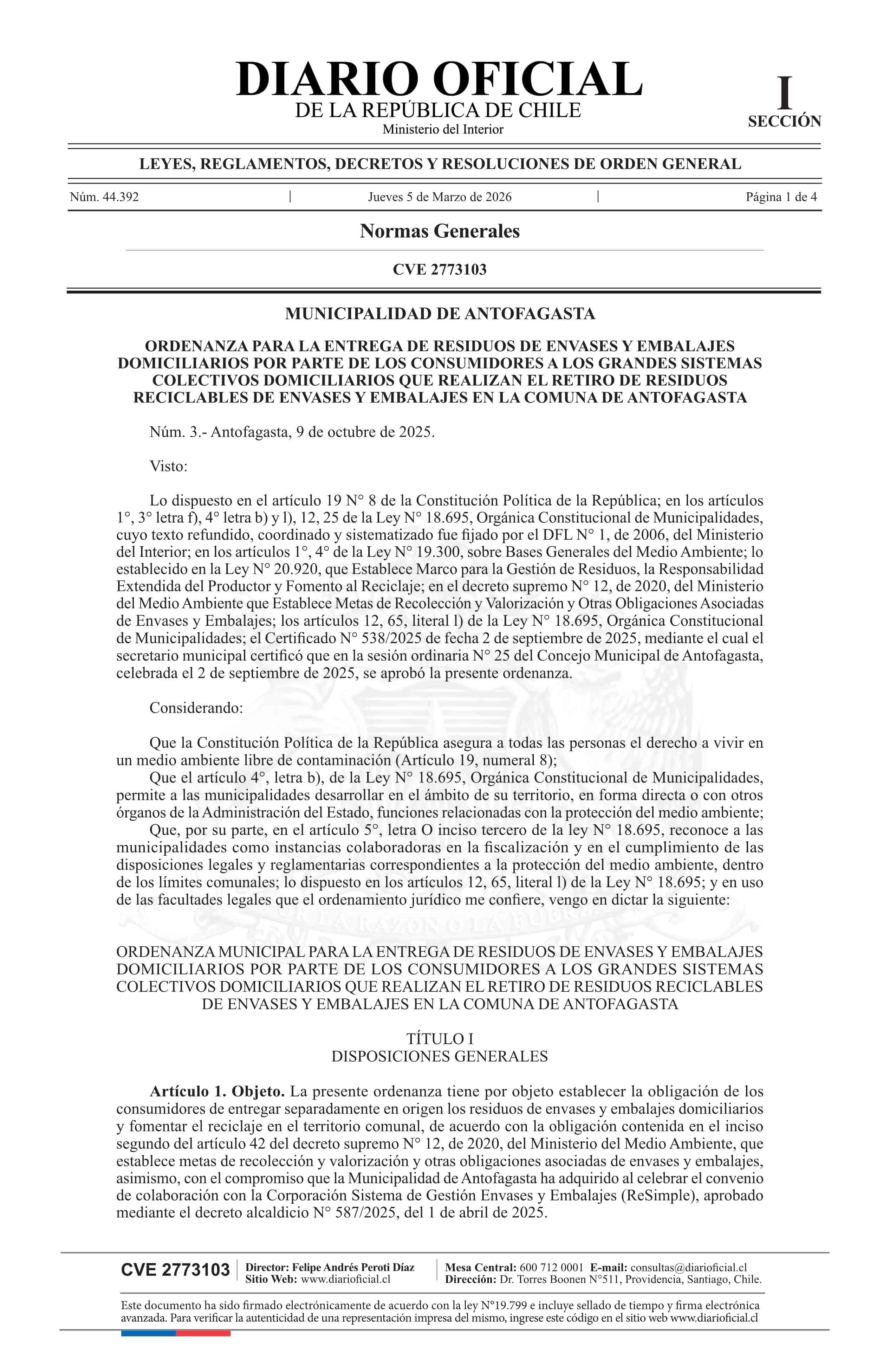 | Título: | Ordenanza Municipal número 3, de 2025.- Entrega de residuos de envases y embalajes domiciliarios por parte de los consumidores a los grandes sistemas colectivos domiciliarios que realizan el retiro de residuos reciclables de envases y embalajes en la comuna de Antofagasta |