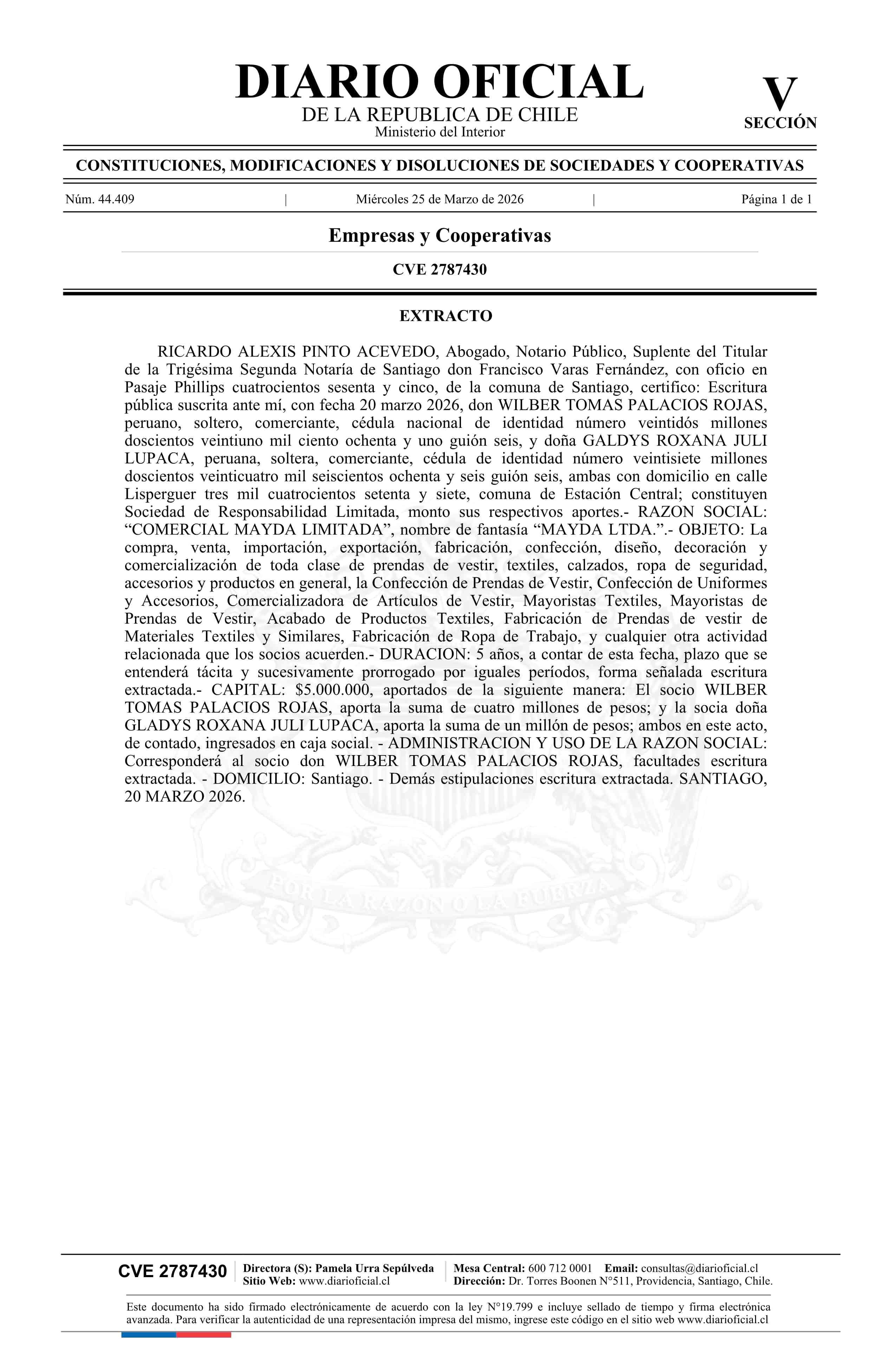 COMERCIAL MAYDA LIMITADA 25-03-2026 Diario Oficial Edición Electrónica |