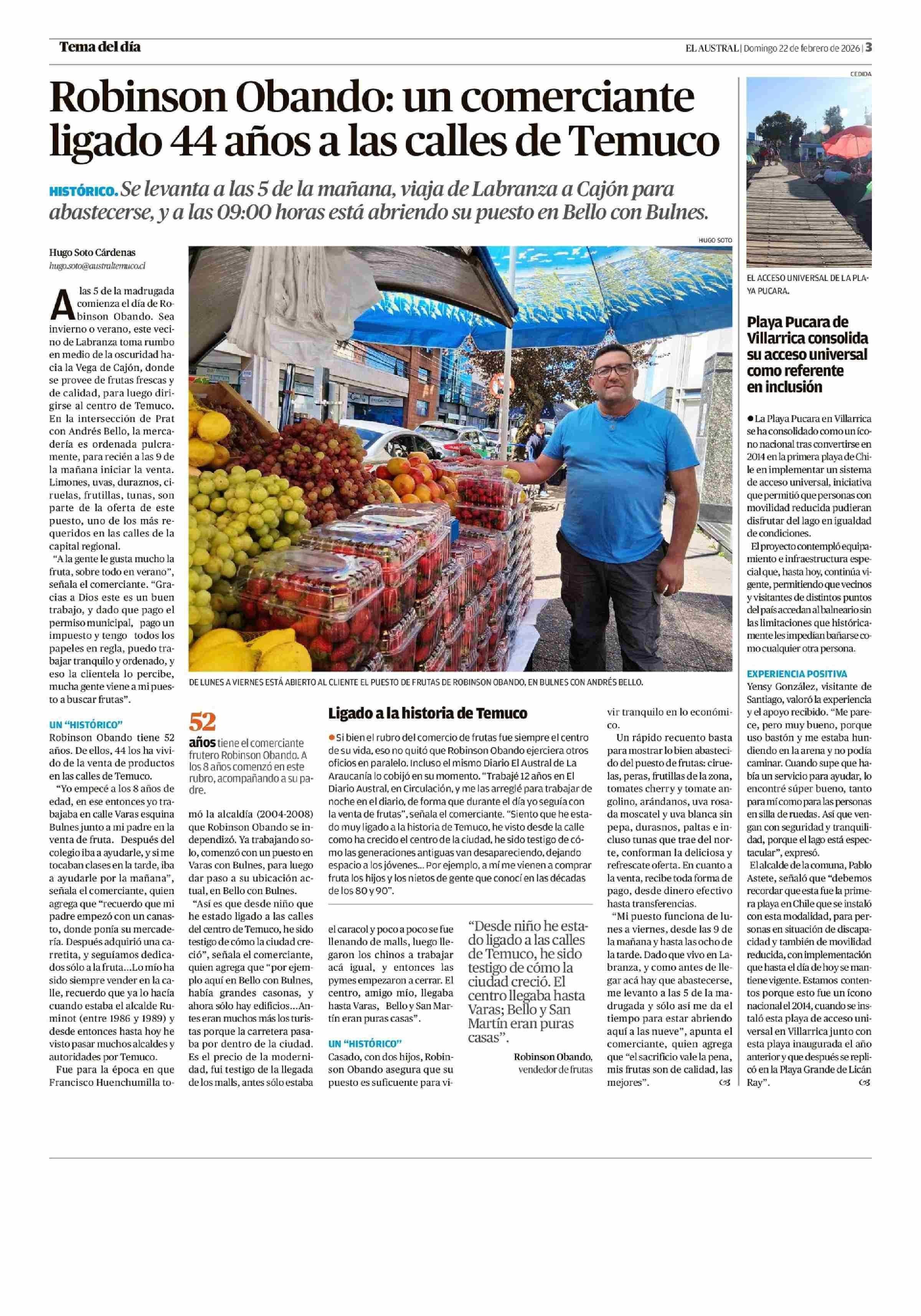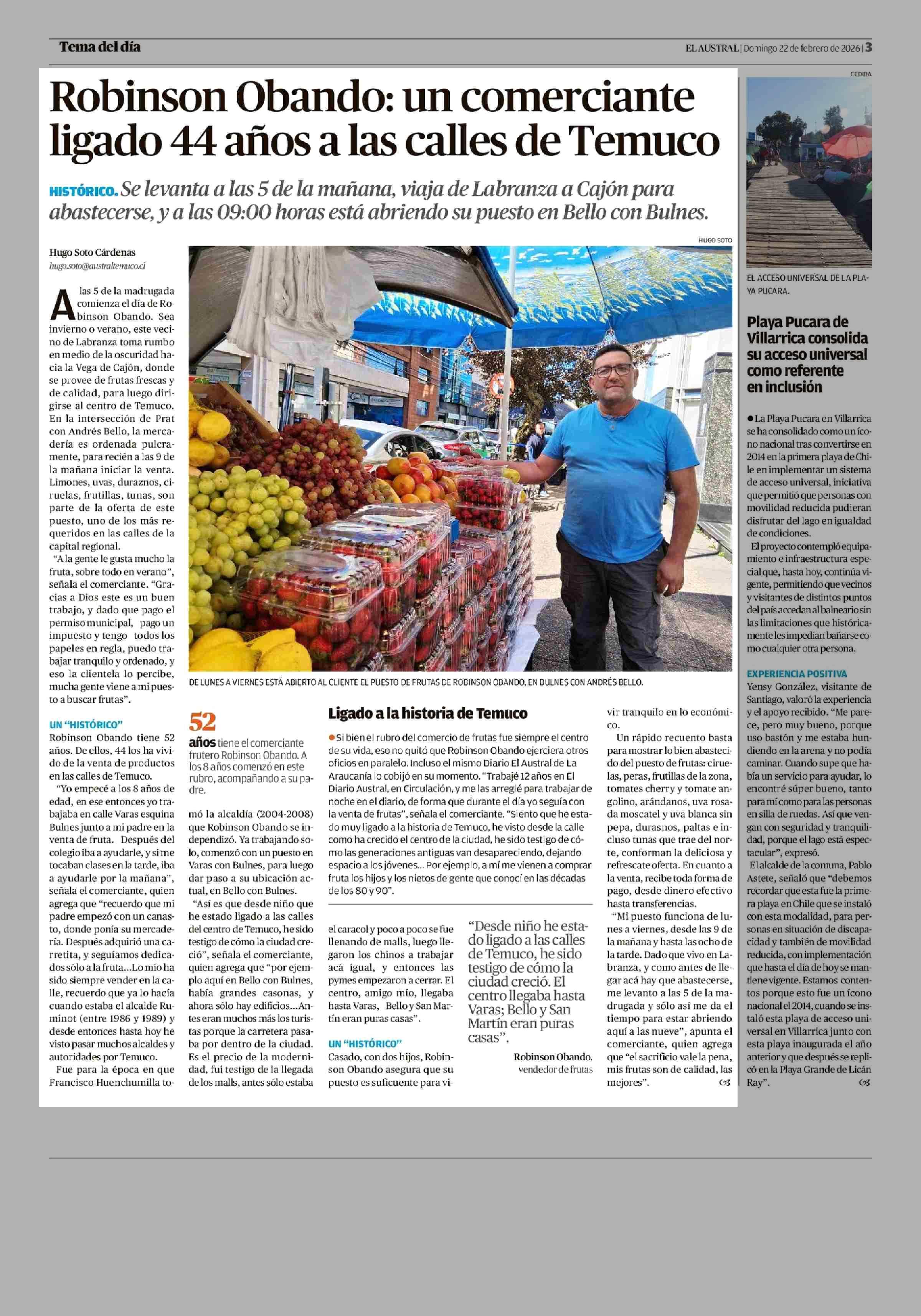 Robinson Obando: un comerciante ligado 44 años a las calles de Temuco 22-02-2026 El Austral de la Araucanía |