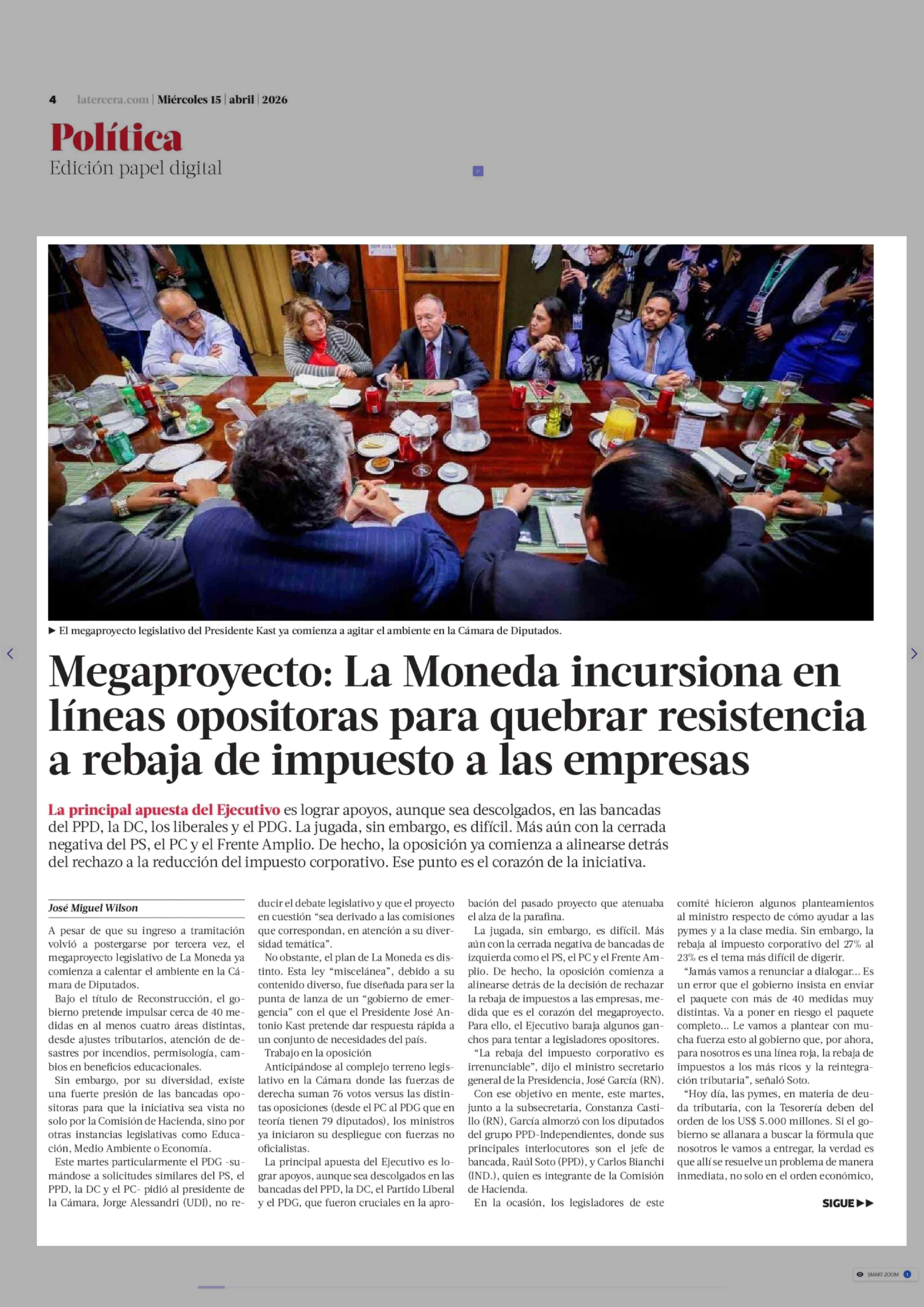 Megaproyecto: La Moneda incursiona en líneas opositoras para quebrar resistencia a rebaja de impuesto a las empresas 15-04-2026 La Tercera |