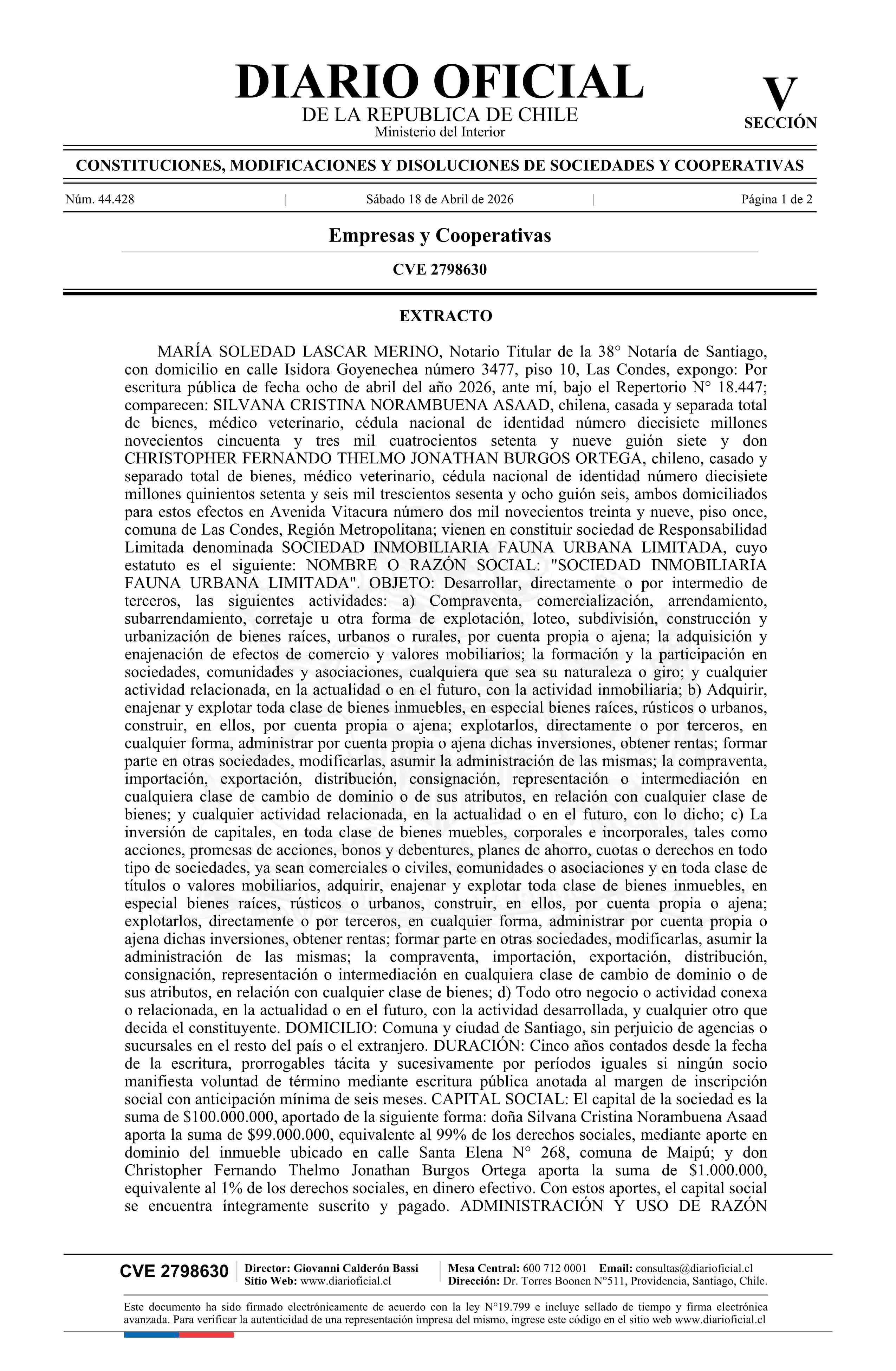 SOCIEDAD INMOBILIARIA FAUNA URBANA LIMITADA 18-04-2026 Diario Oficial Edición Electrónica |