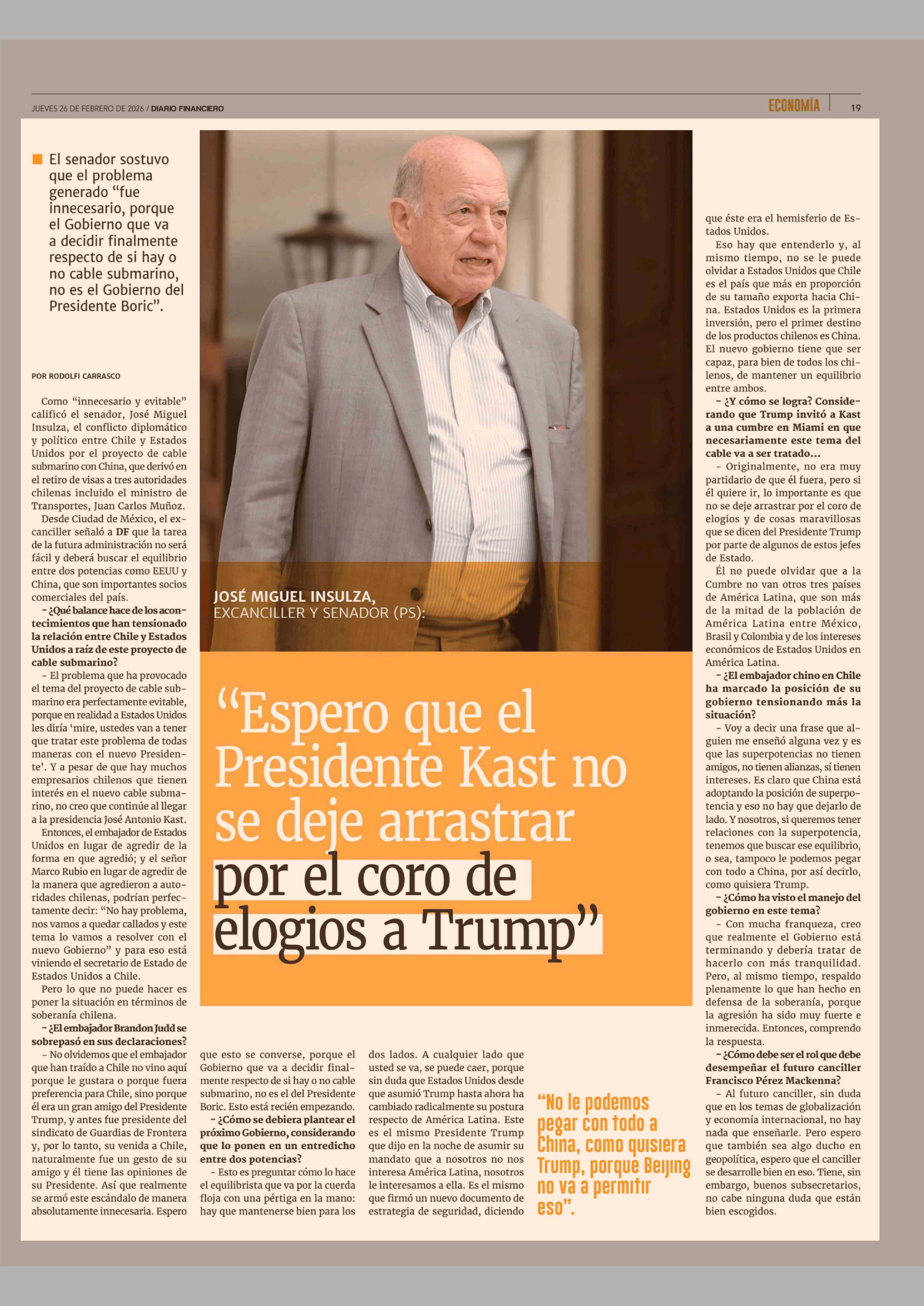 Título: "Espero que el Presidente Kast no se deje arrastrar por el coro de elogios a Trump"