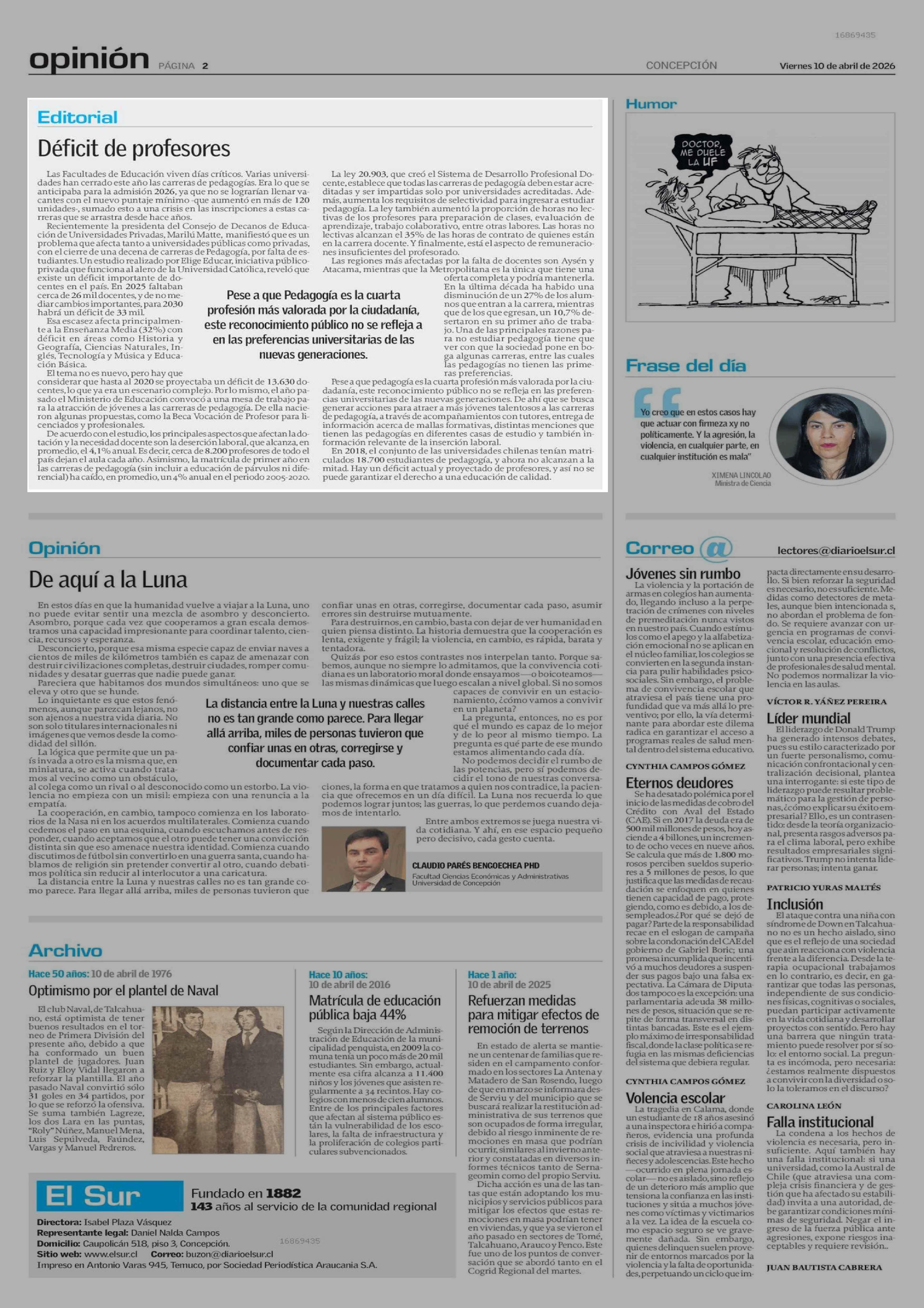 Editorial: Déficit de profesores 10-04-2026 El Sur |