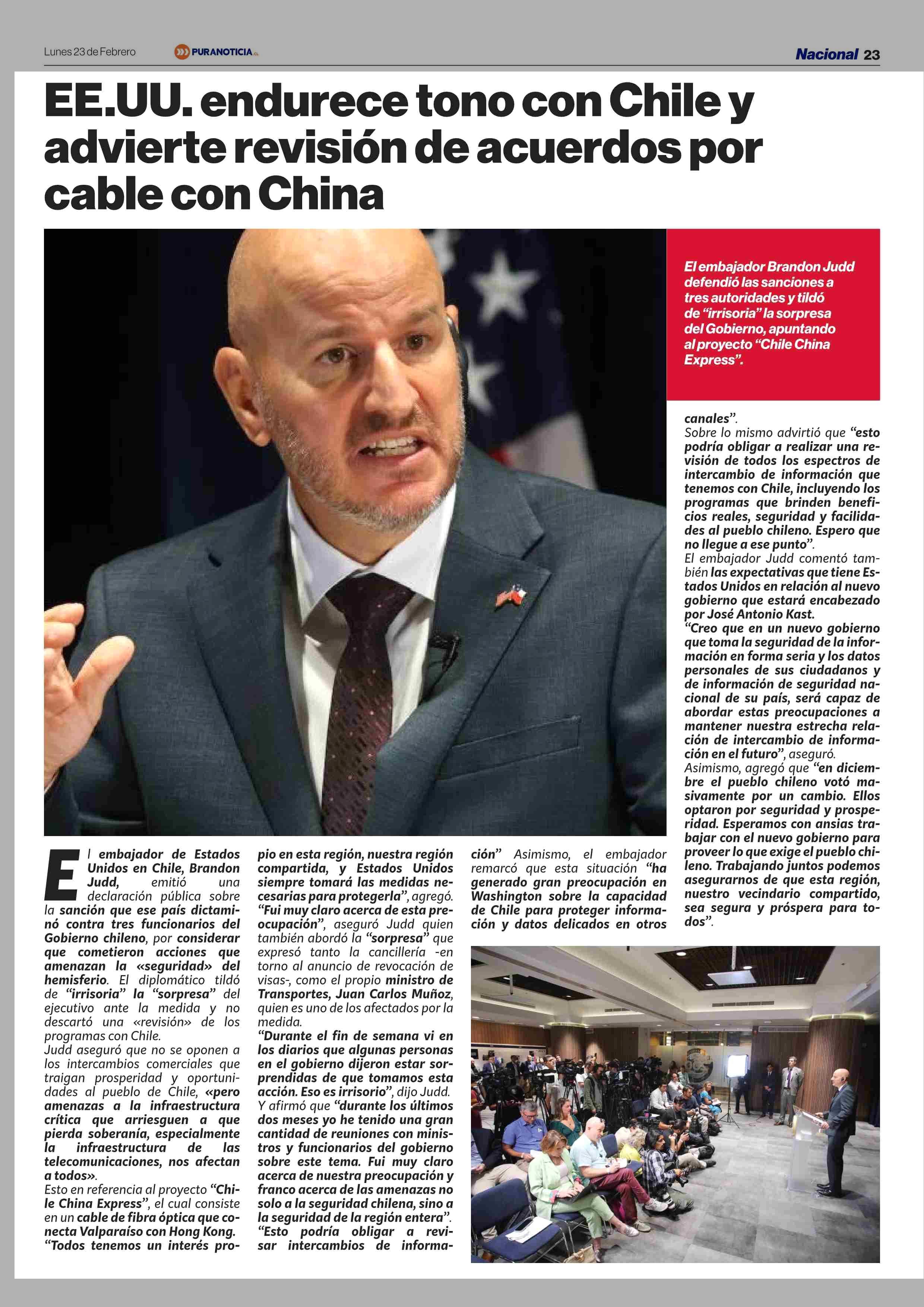 EE.UU. endurece tono con Chile y advierte revisión de acuerdos por cable con China 23-02-2026 Puranoticia.cl |