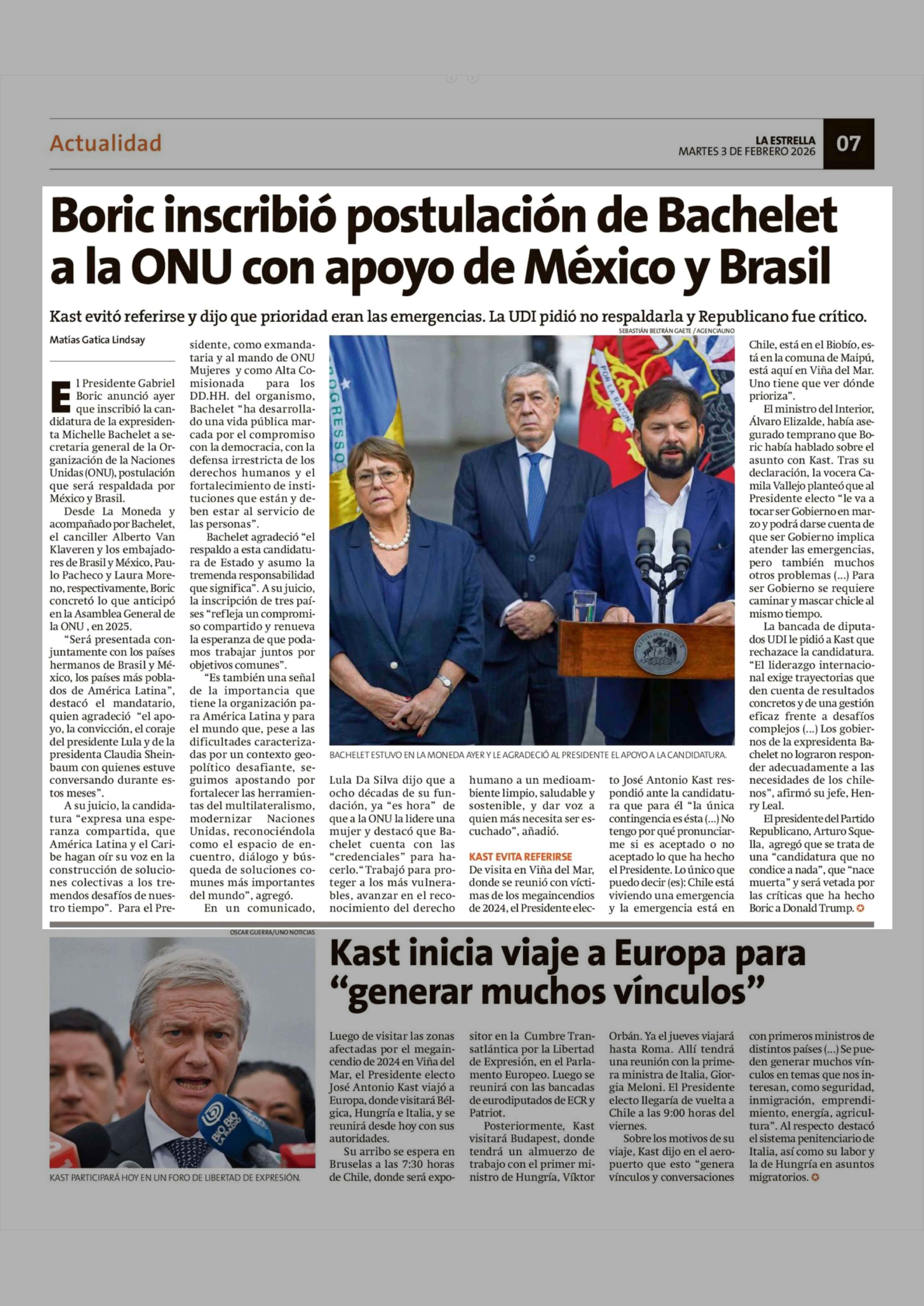 Título: Boric inscribió postulación de Bachelet a la ONU con apoyo de México y Brasil