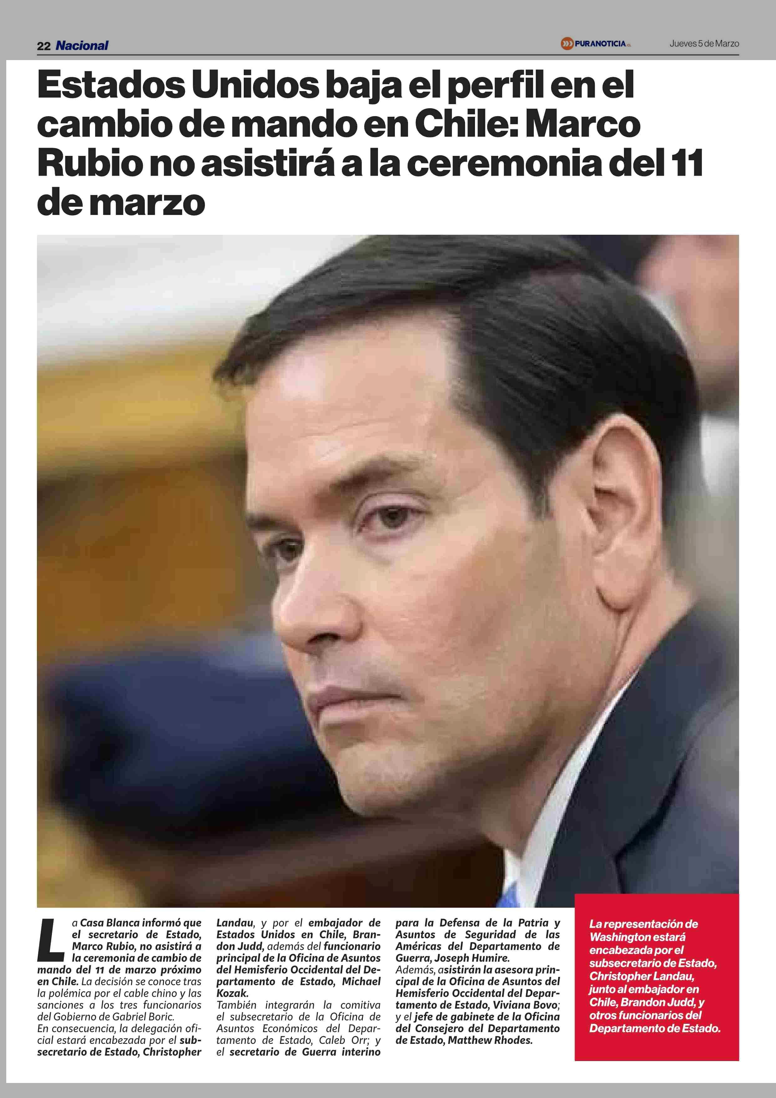 | Título: | Estados Unidos baja el perfil en el cambio de mando en Chile: Marco Rubio no asistirá a la ceremonia del 11 de marzo |