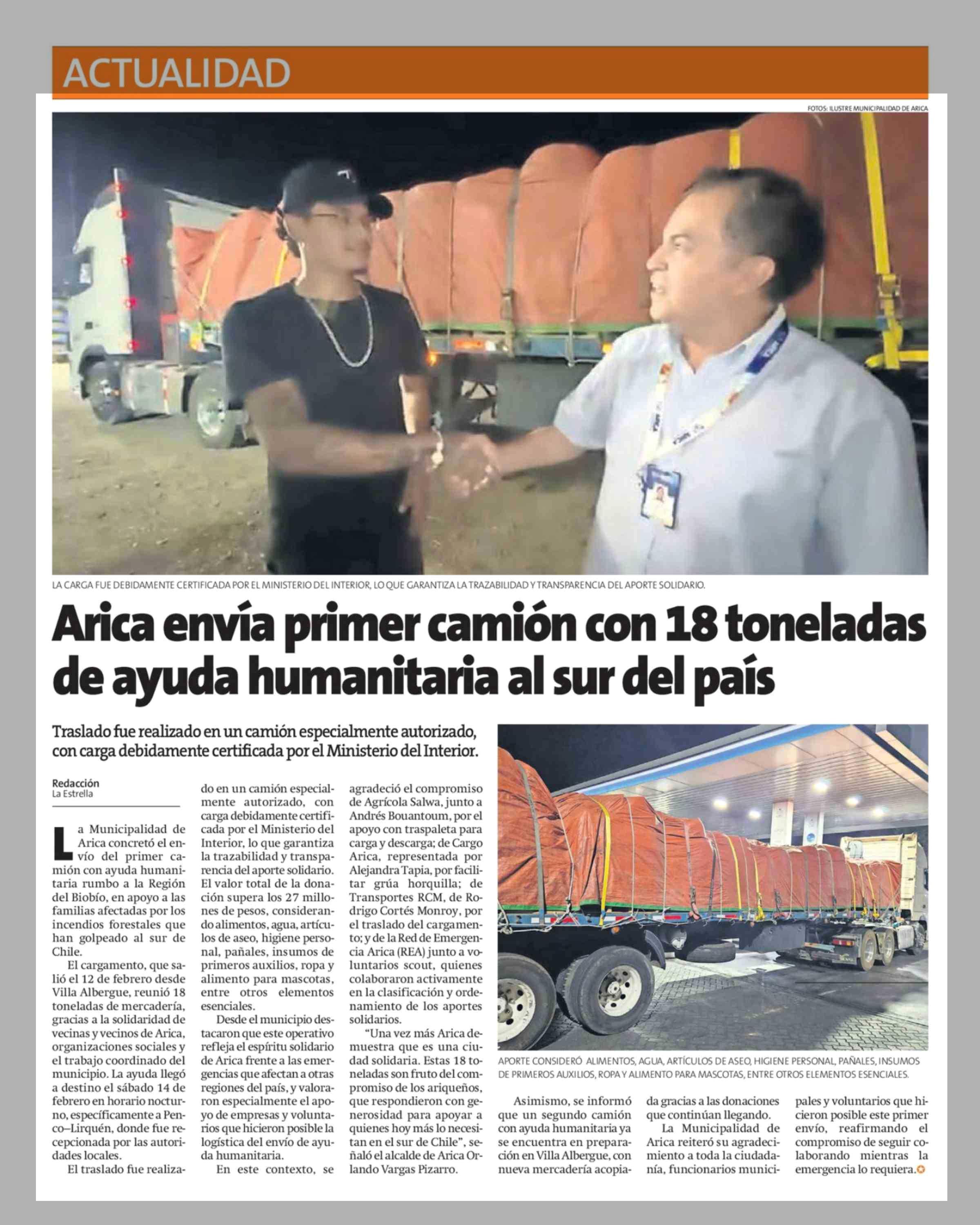 Arica envía primer camión con 18 toneladas de ayuda humanitaria al sur del país 23-02-2026 La Estrella de Arica |