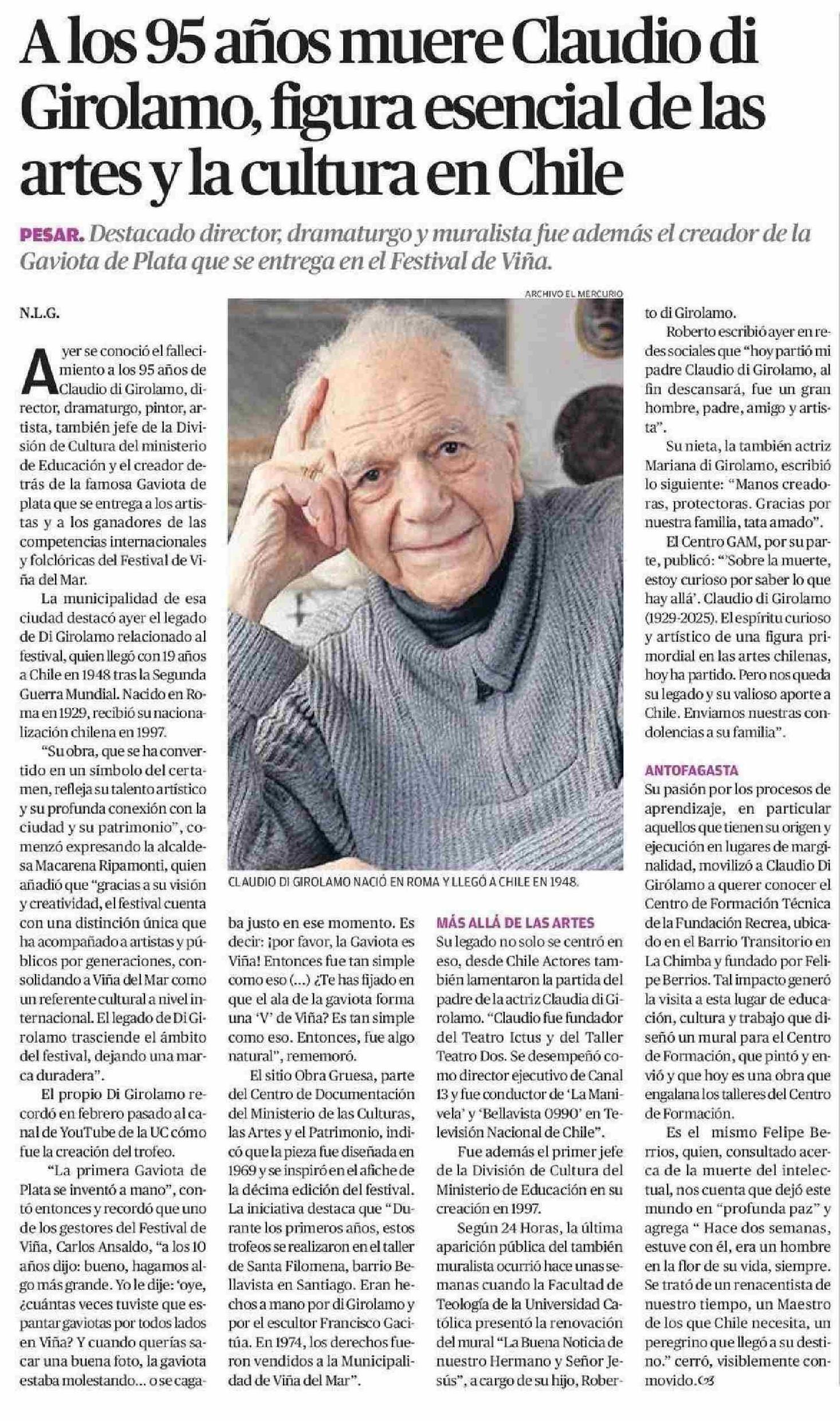 Alos 95 años muere Claudio di Girolamo, figura esencial de las artes y la cultura en Chile 23-05-2025 El Mercurio de Antofagasta |