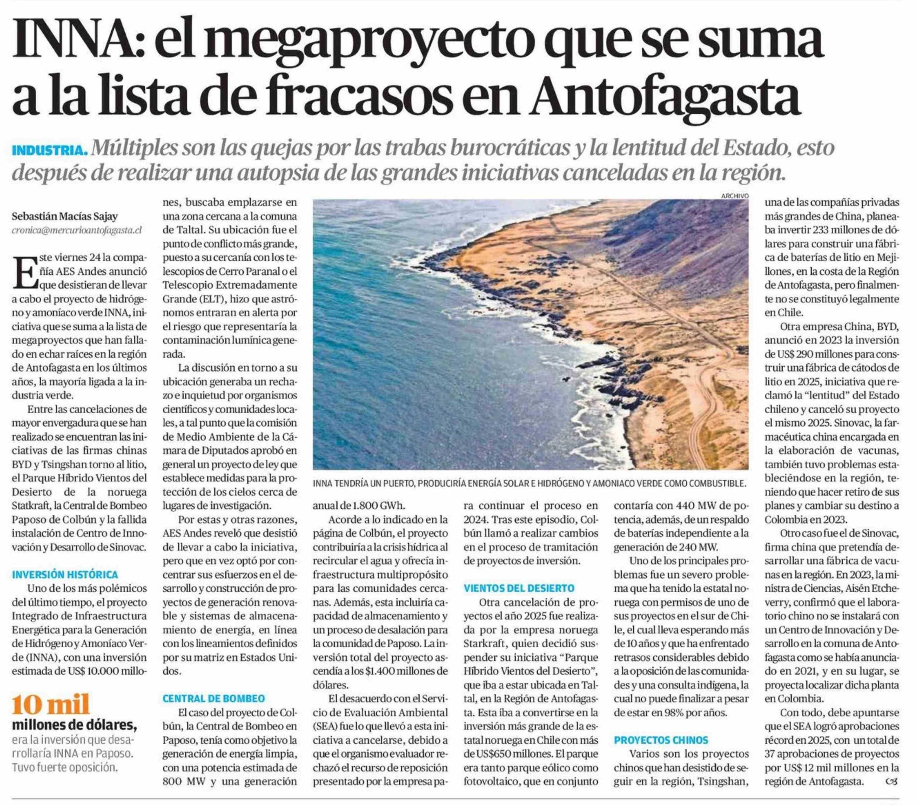 INNA: el megaproyecto que se suma a la lista de fracasos en Antofagasta 25-01-2026 El Mercurio de Antofagasta |
