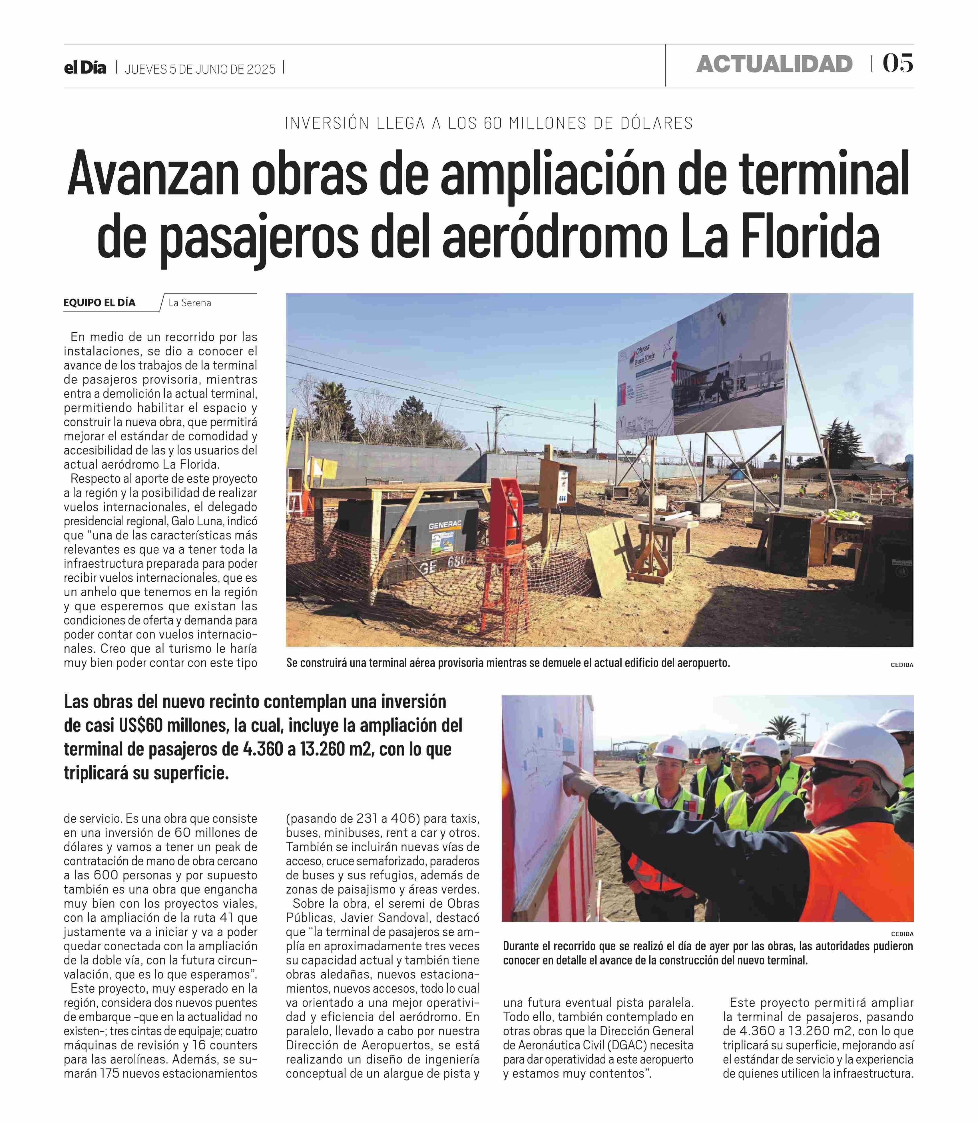 Avanzan obras de ampliación de terminal de pasajeros del aeródromo La Florida 05-06-2025 El Día |