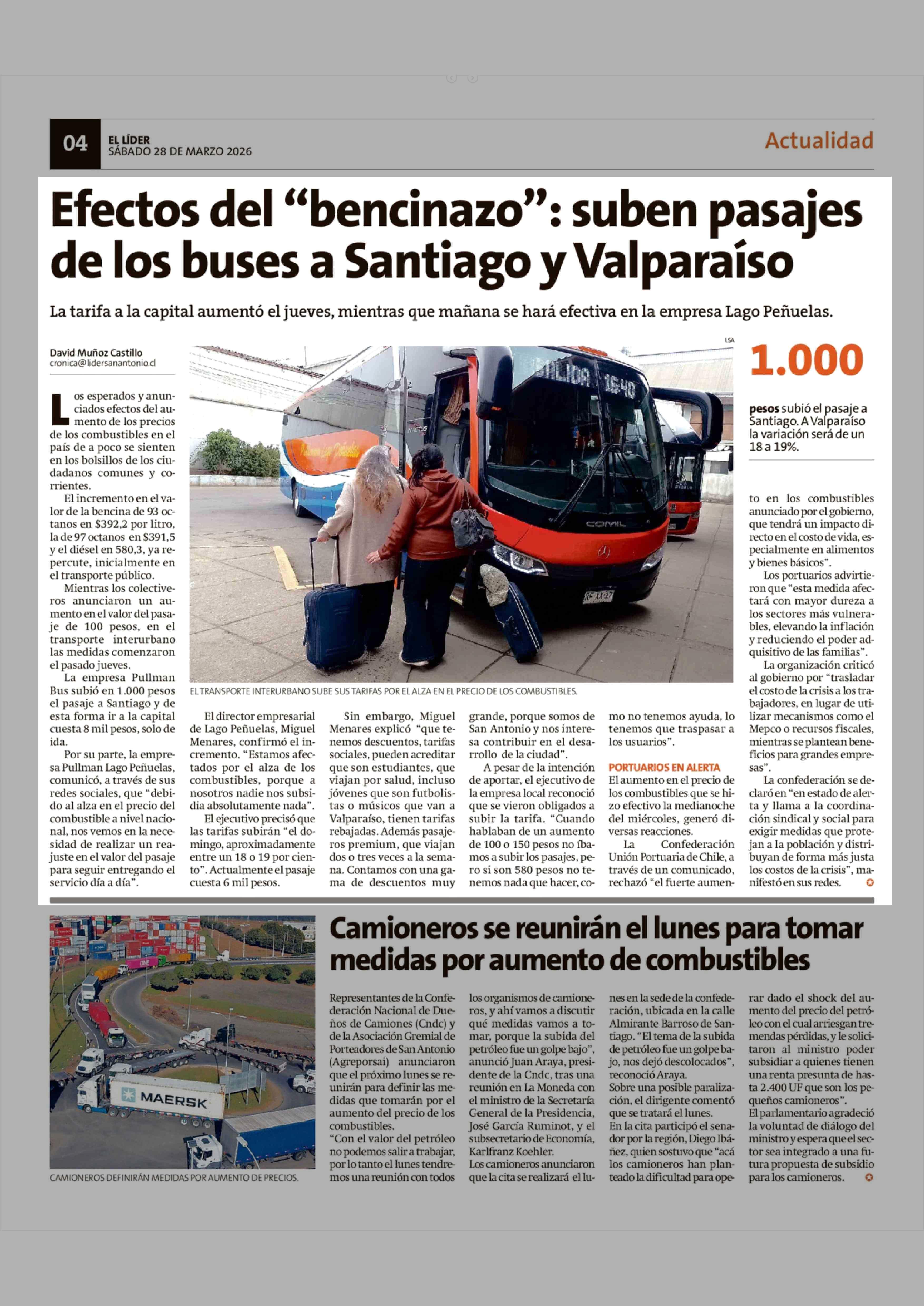 Efectos del "bencinazo": suben pasajes de los buses a Santiago y Valparaíso 28-03-2026 El Líder |