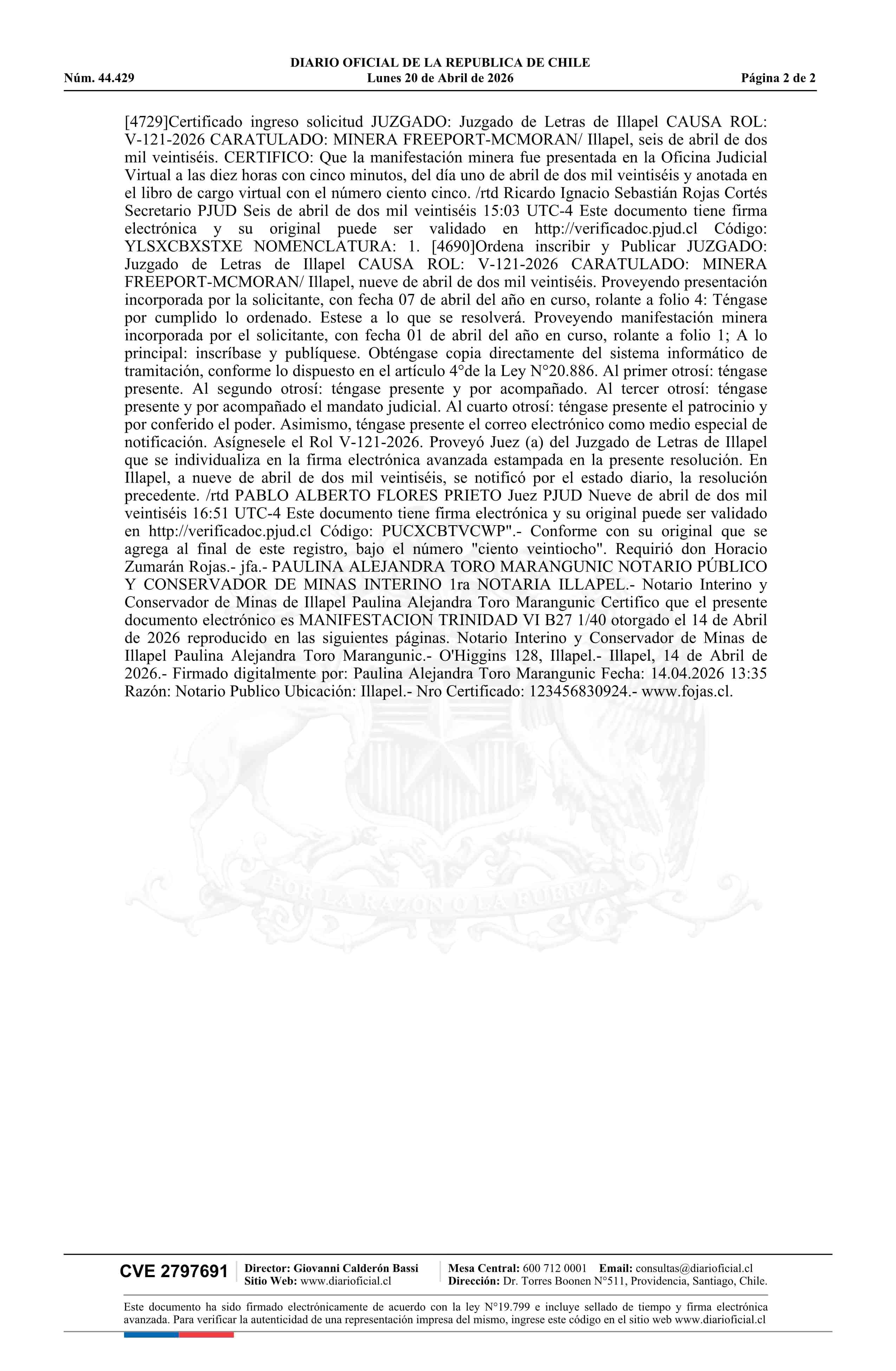 TRINIDAD VI B27 1/40 / Minera Freeport-McMoran South America Limitada 20-04-2026 DIARIO OFICIAL CHILE - BOLETÍN OFICIAL DE MINERÍA |