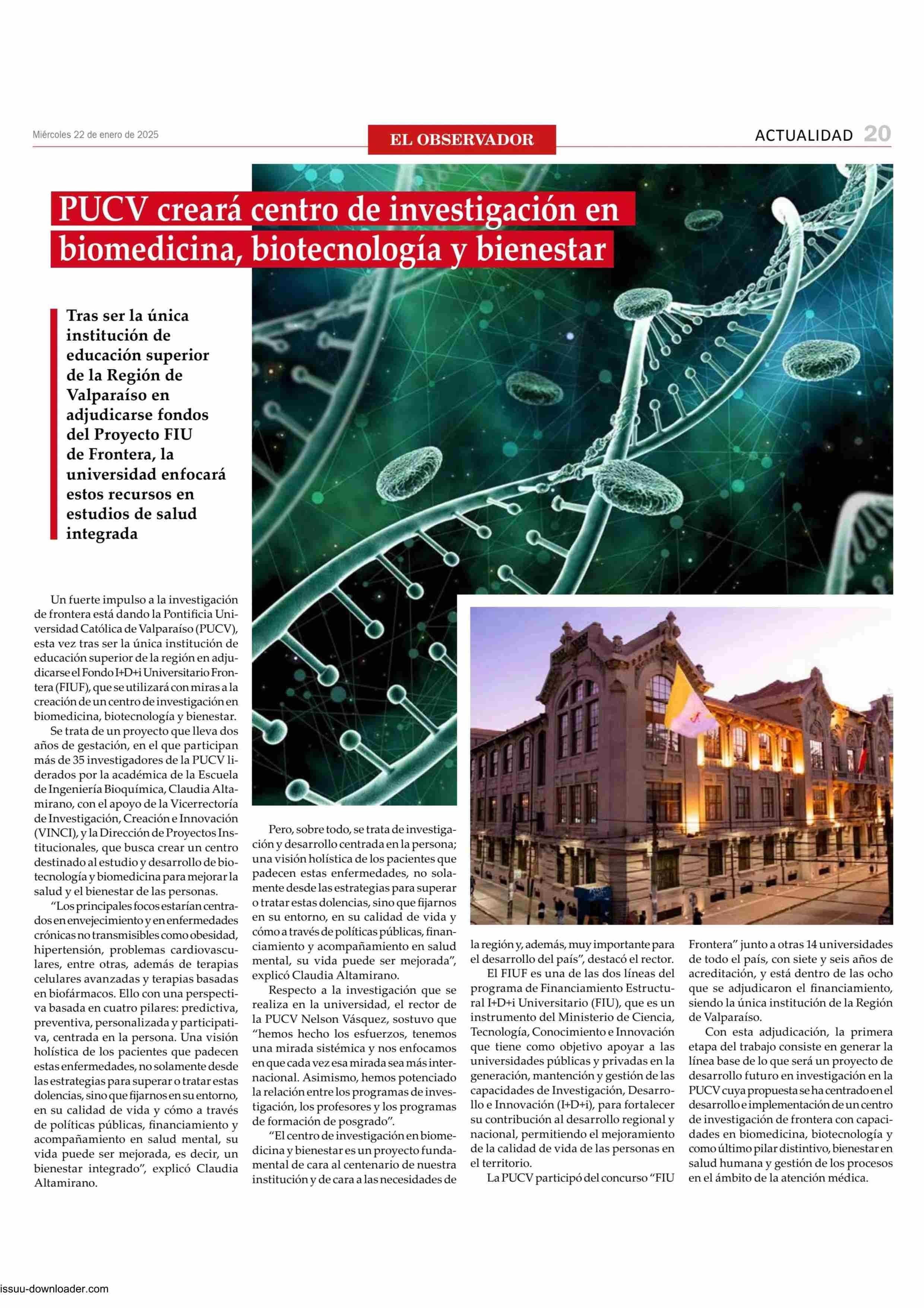 PUCV creará centro de investigación en biomedicina, biotecnología y bienestar 22-01-2025 El Observador Vespertino |