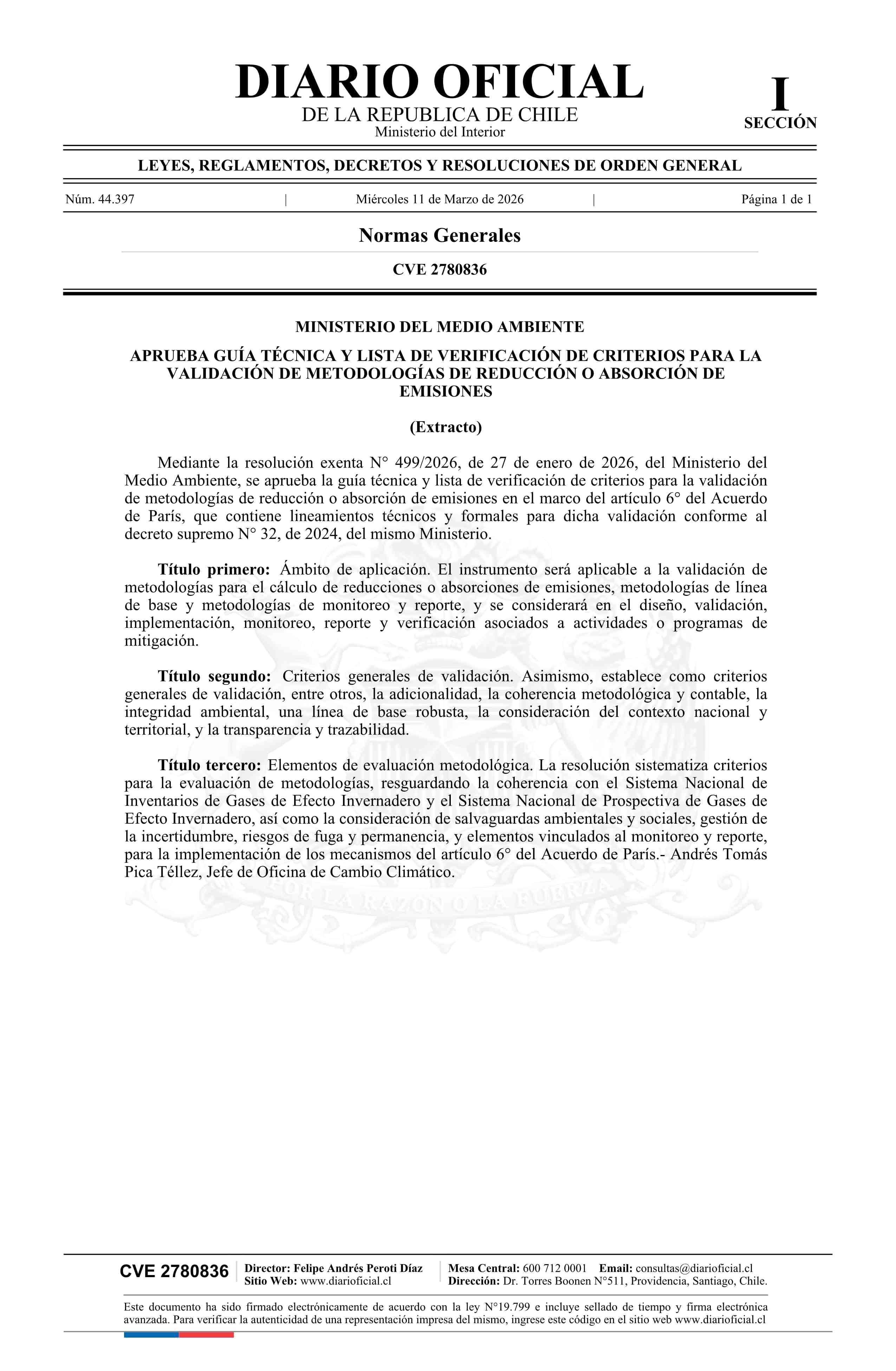| Título: | Extracto de resolución exenta número 499, de 2026.- Aprueba guía técnica y lista de verificación de criterios para la validación de metodologías de reducción o absorción de emisiones |