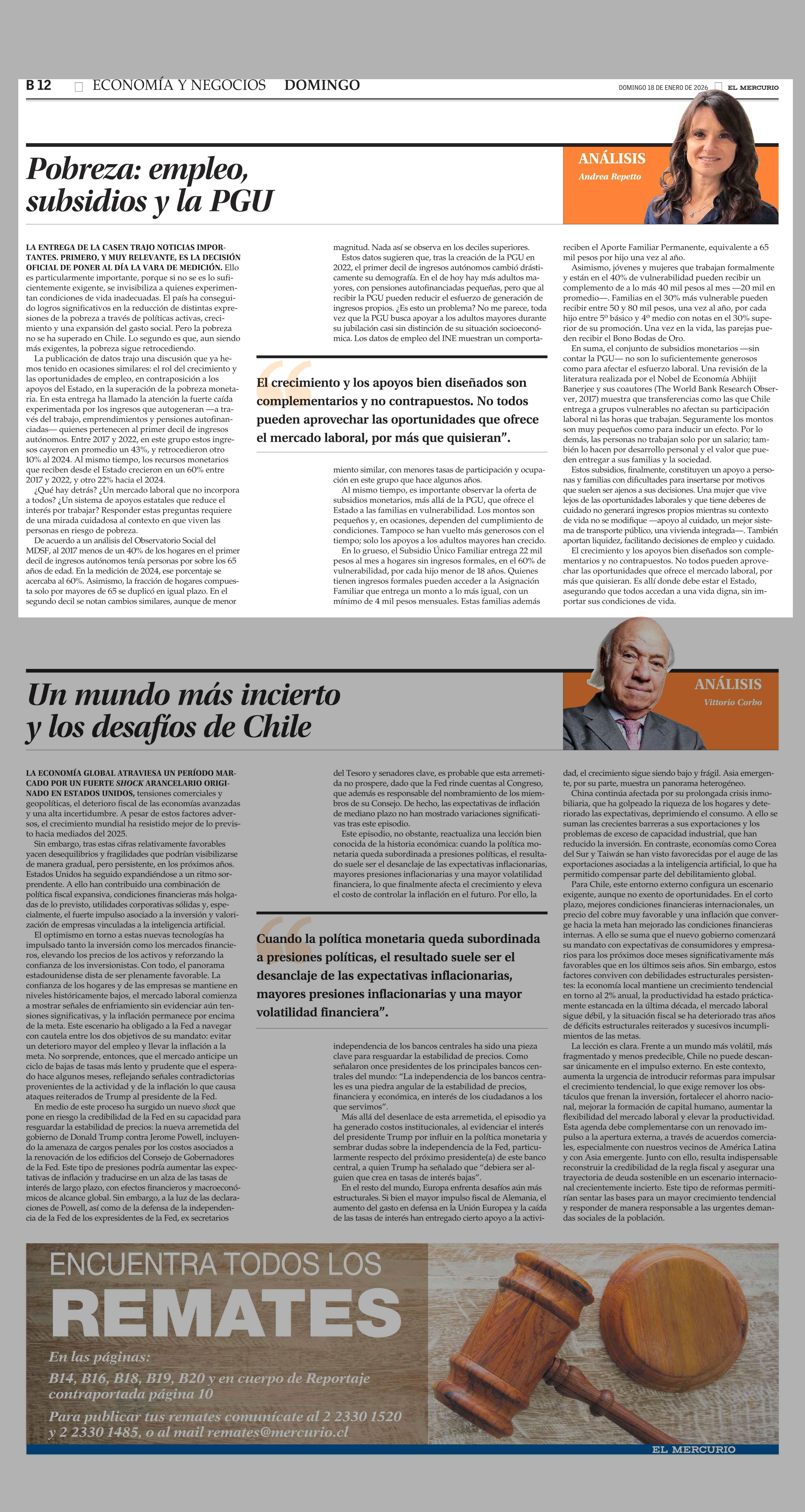 Columnas de Opinión: Pobreza: empleo, subsidios y la PGU 18-01-2026 El Mercurio |