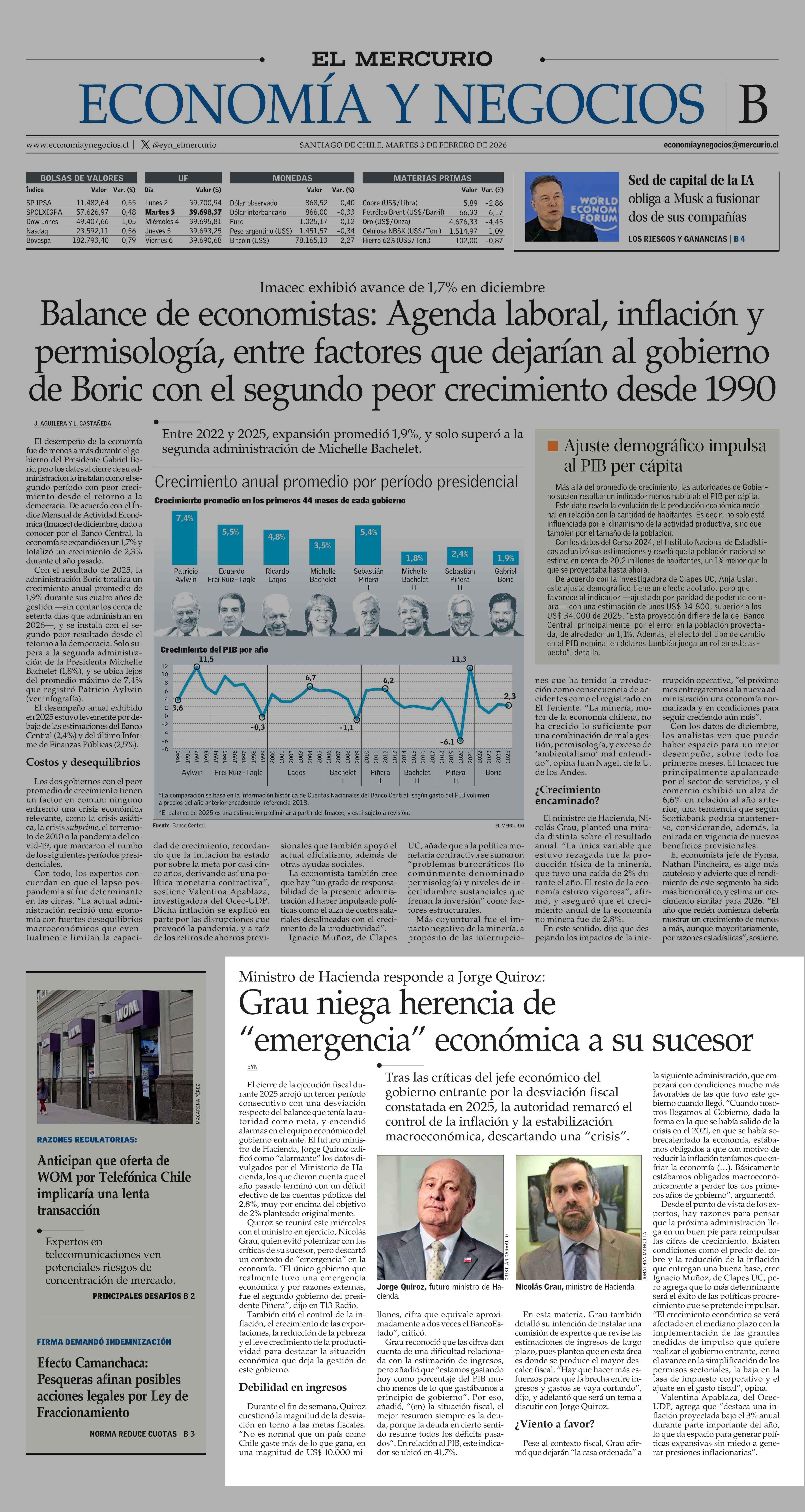 Grau niega herencia de “emergencia” económica a su sucesor 03-02-2026 El Mercurio |
