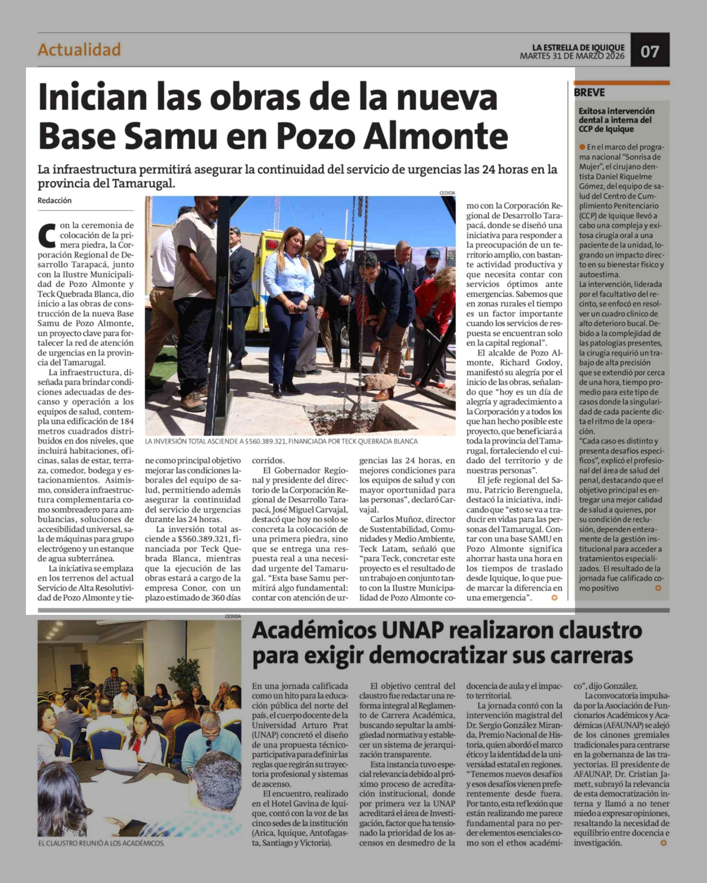 | Fecha: | 31-03-2026 | Sector: | Noticia general | Región: | Región de Tarapacá |