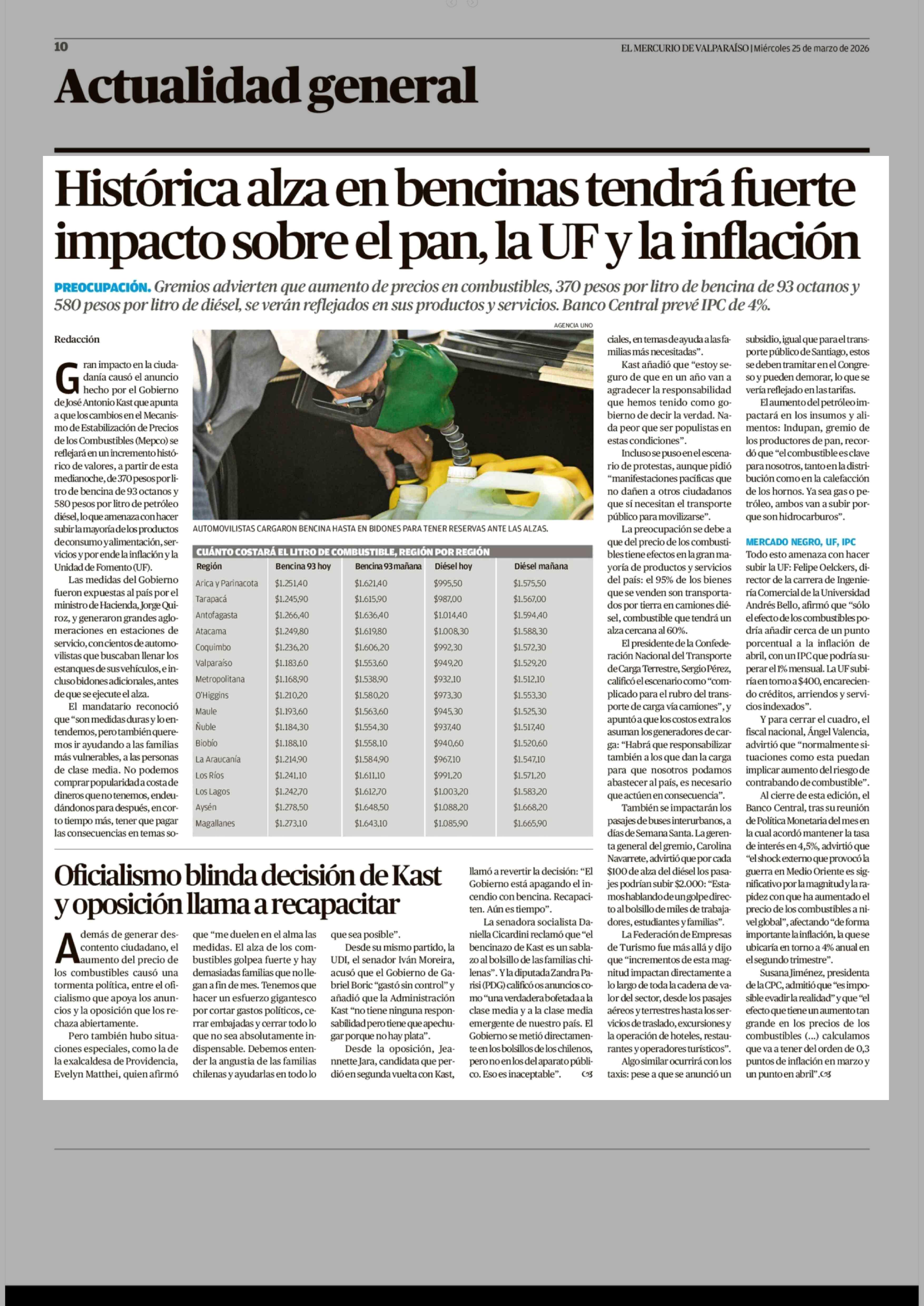 Histórica alza en bencinas tendrá fuerte impacto sobre el pan, la UF y la inflación 25-03-2026 El Mercurio de Valparaíso |