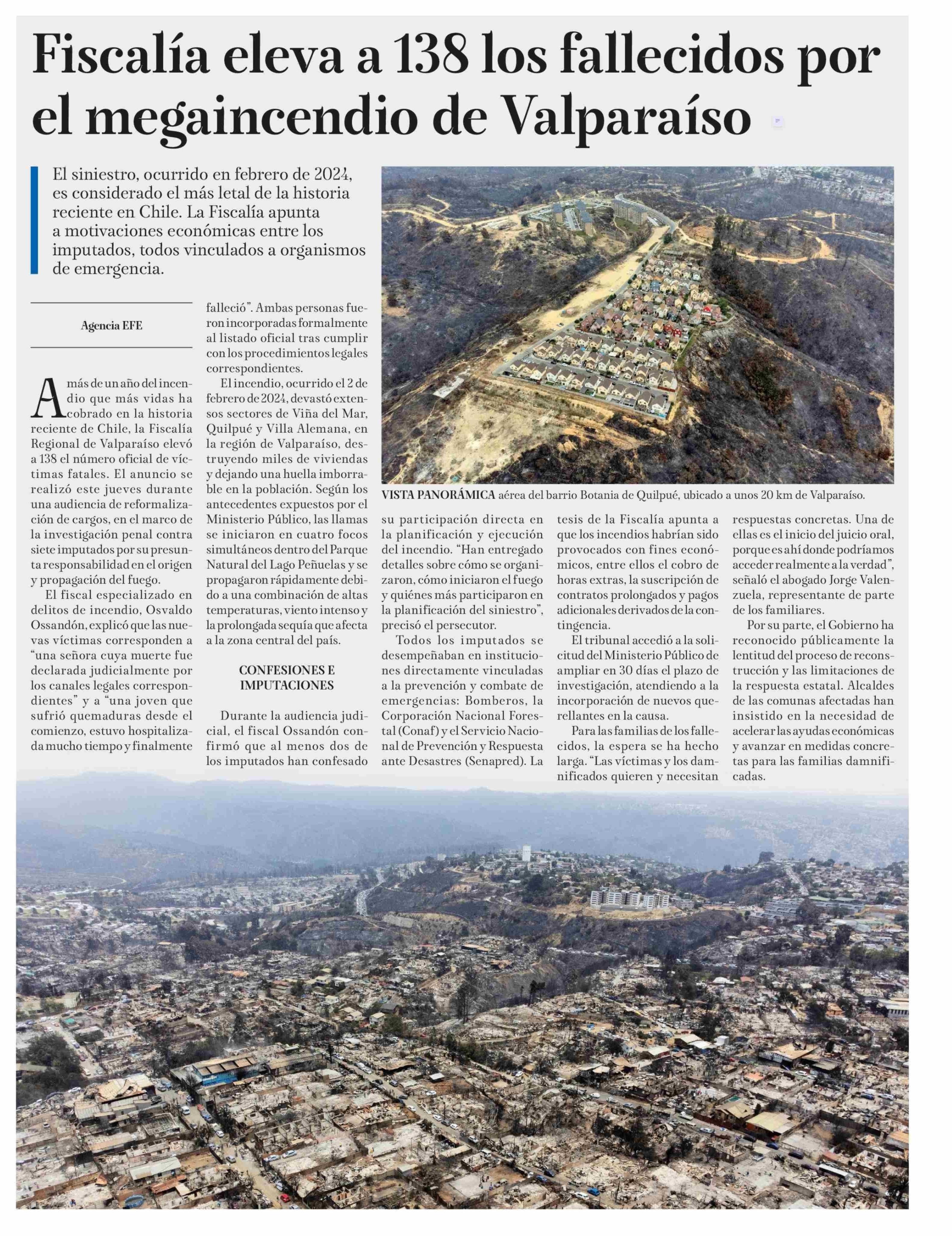 Fiscalía eleva a 138 los fallecidos por el megaincendio de Valparaíso 23-05-2025 La Tribuna |