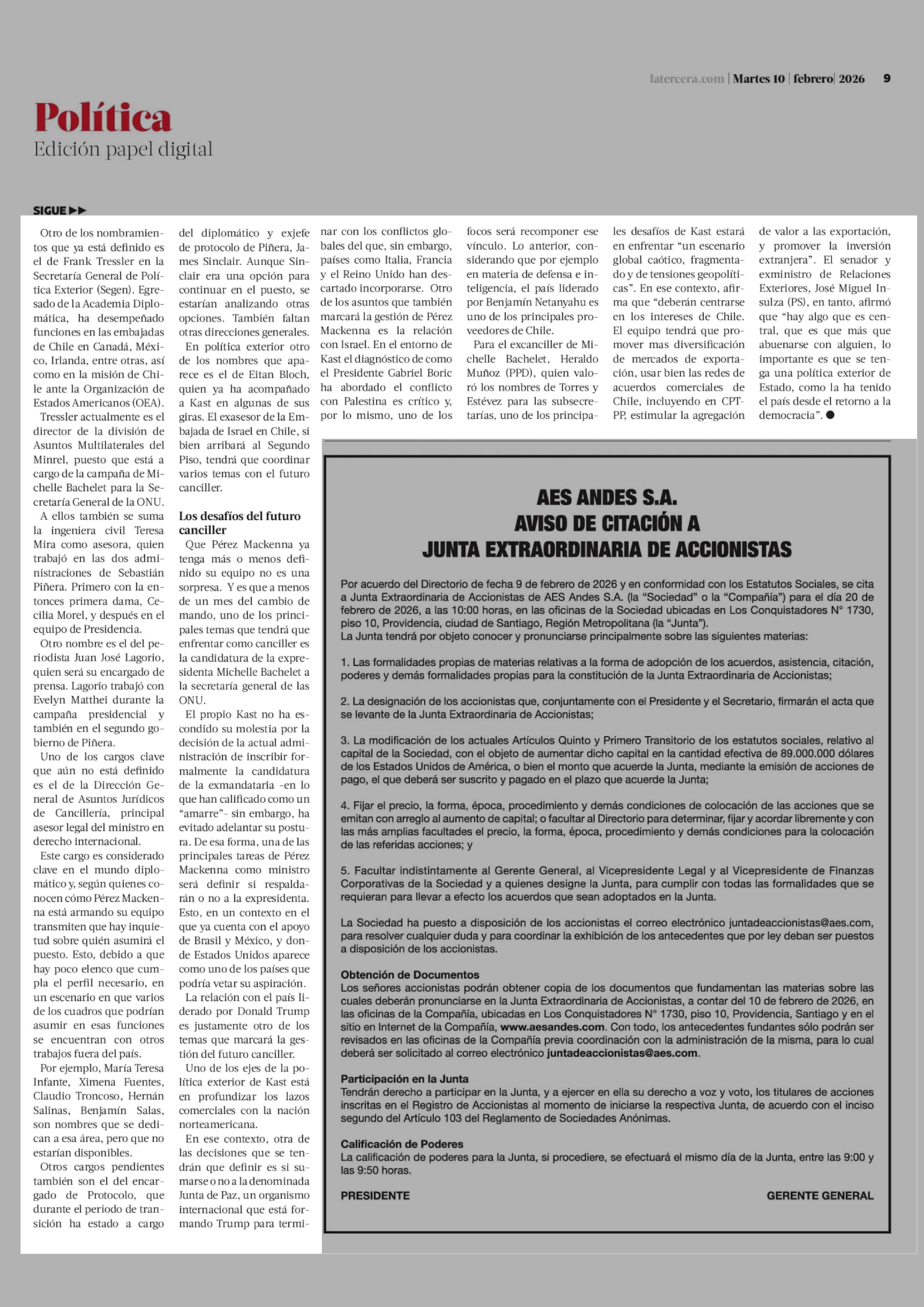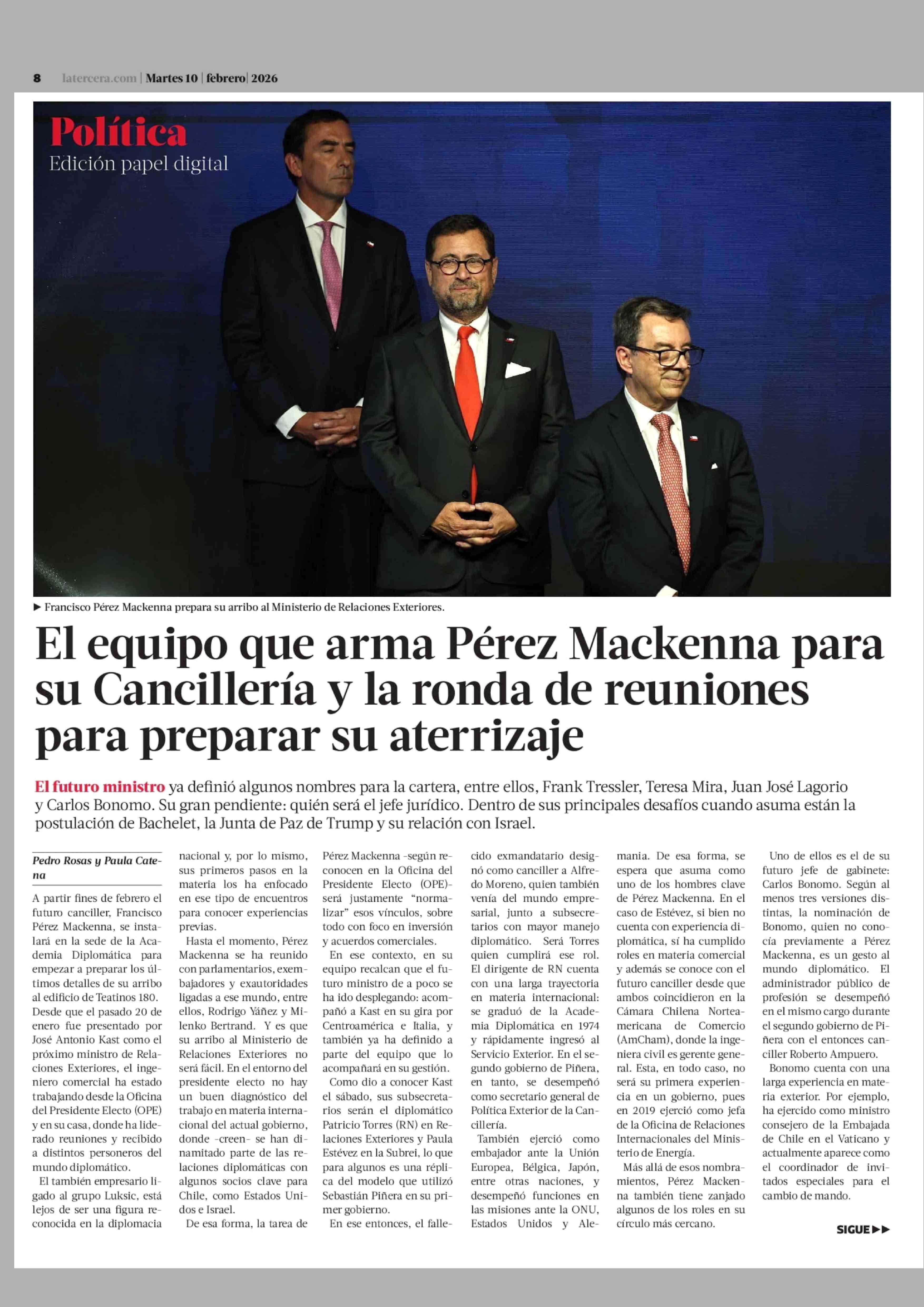 El equipo que arma Pérez Mackenna para su Cancillería y la ronda de reuniones para preparar su aterrizaje 10-02-2026 La Tercera |