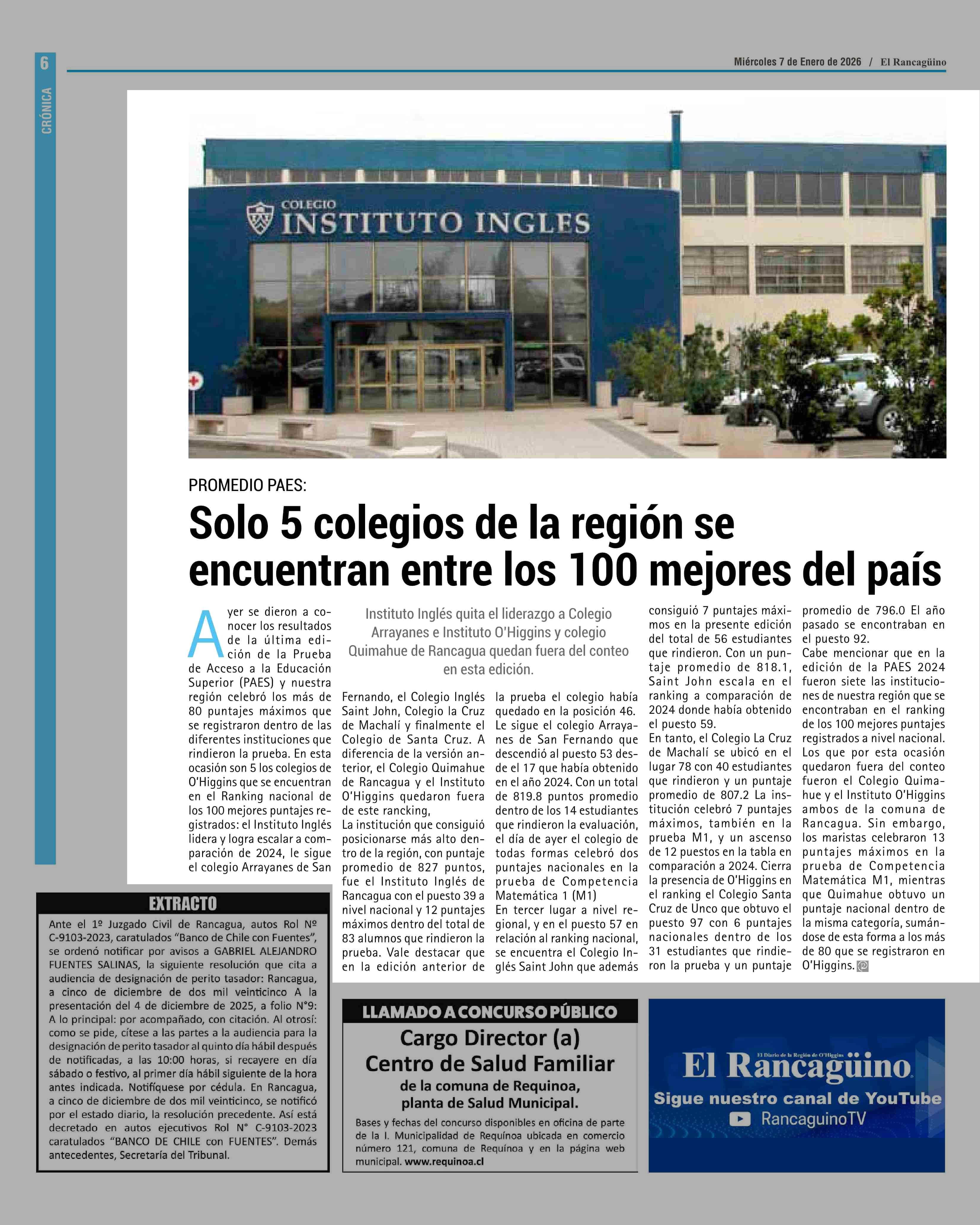 Solo 5 colegios de la región se encuentran entre los 100 mejores del país 07-01-2026 El Rancagüino |
