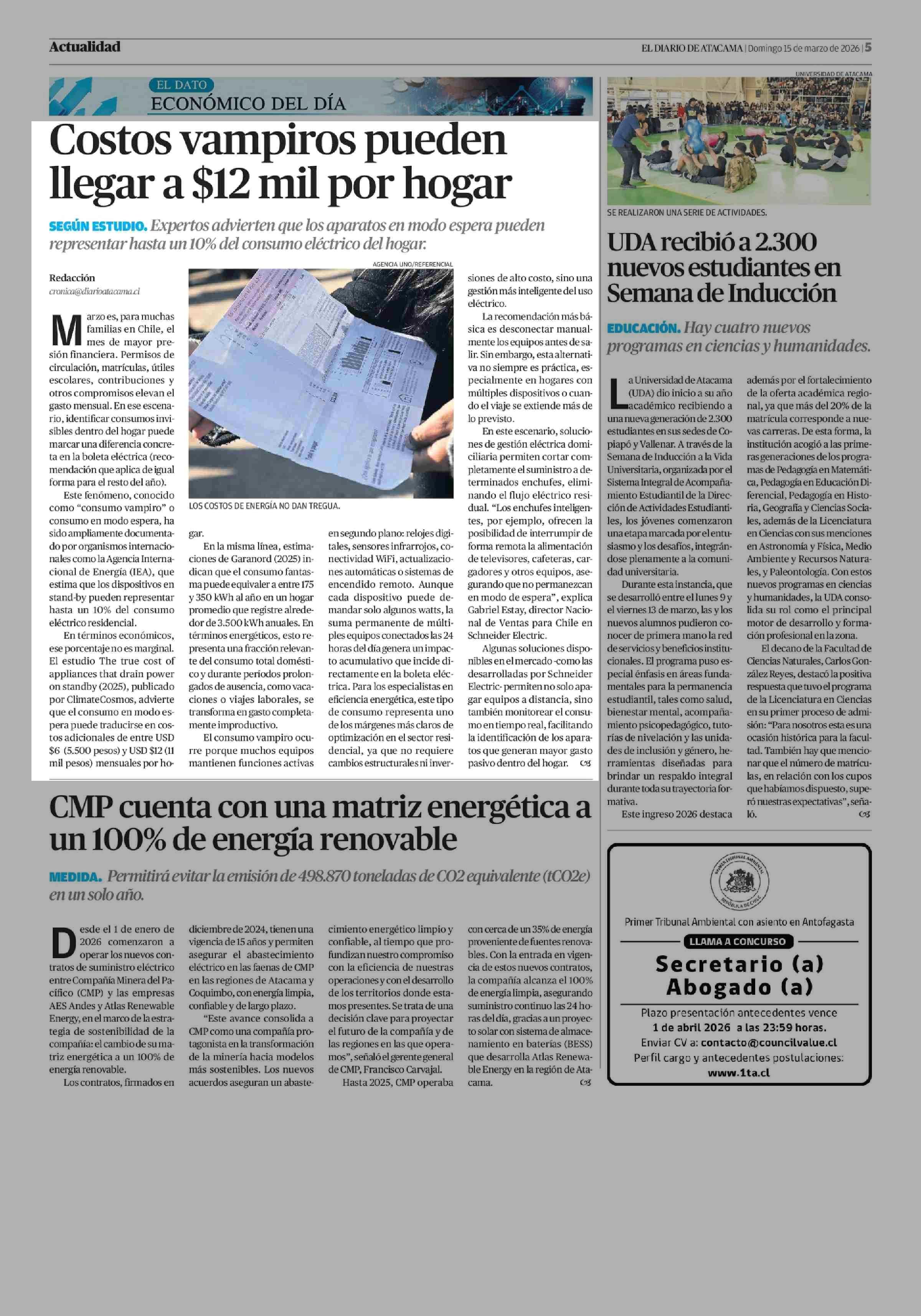 Costos vampiros pueden llegar a $12 mil por hogar 15-03-2026 El Diario de Atacama |