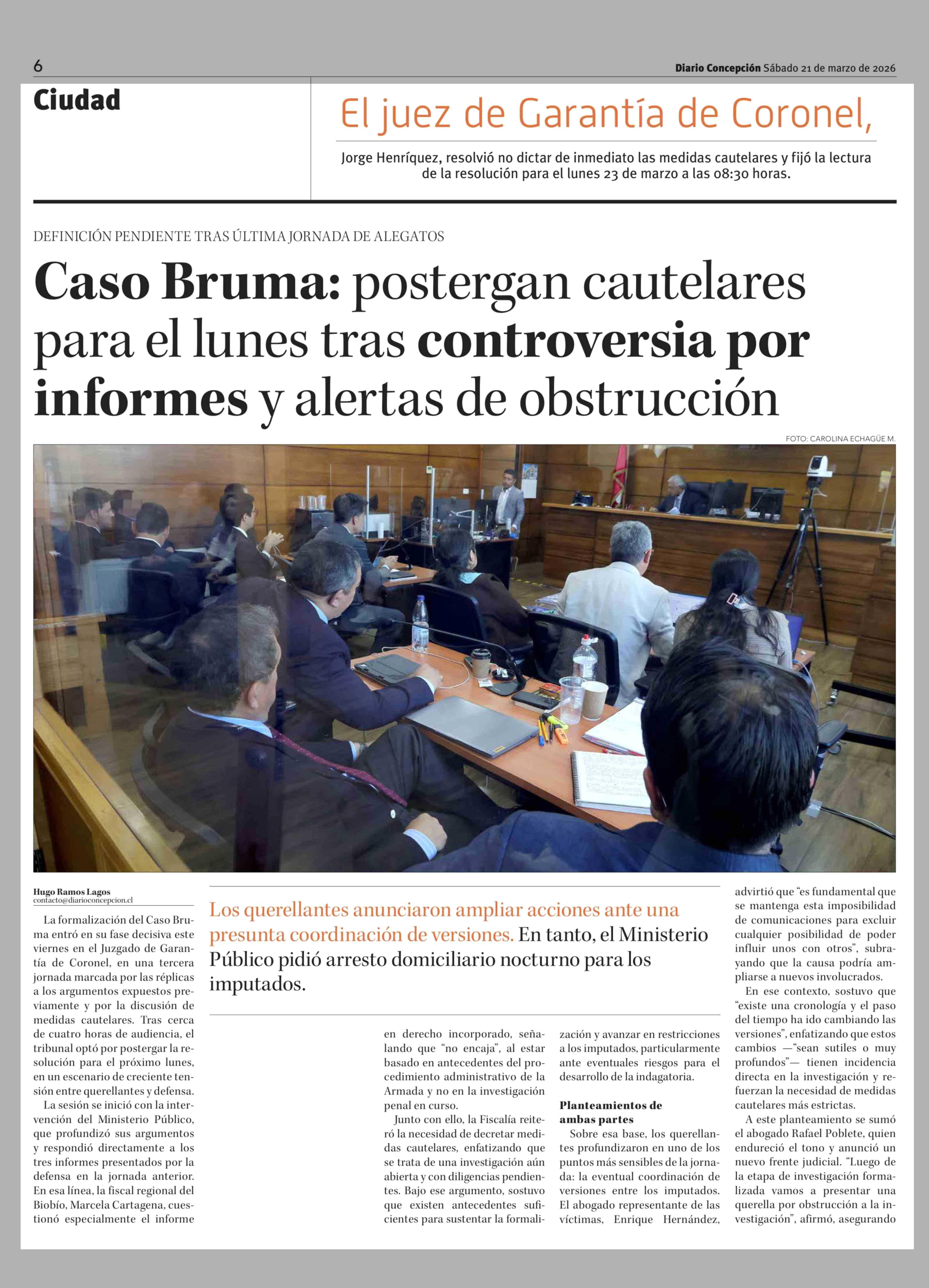 Caso Bruma: postergan cautelares para el lunes tras controversia por informes y alertas de obstrucción 21-03-2026 Diario Concepción |
