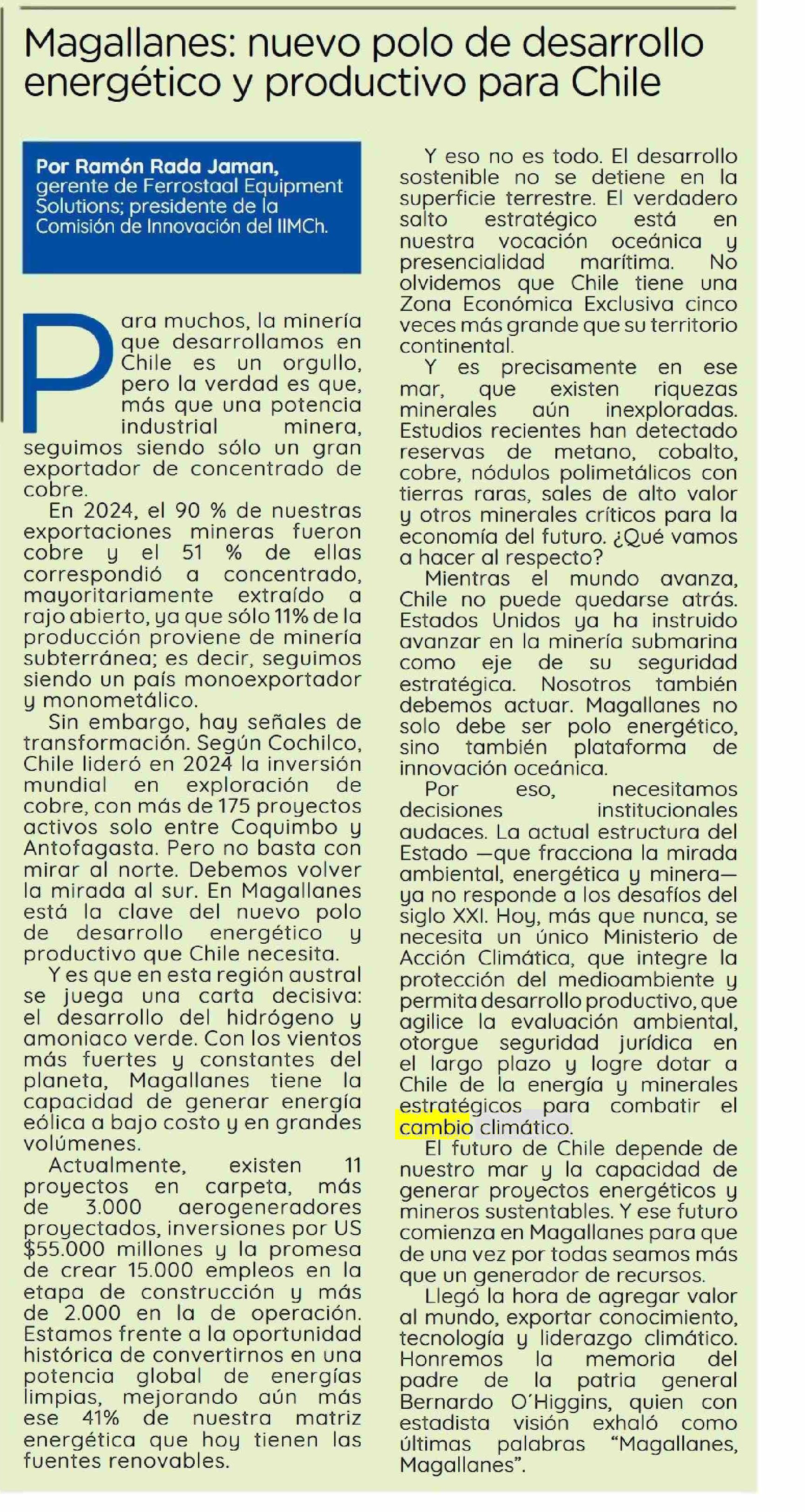 | Título: | COLUMNAS DE OPINIÓN: Magallanes: nuevo polo de desarrollo energético y productivo para Chile |