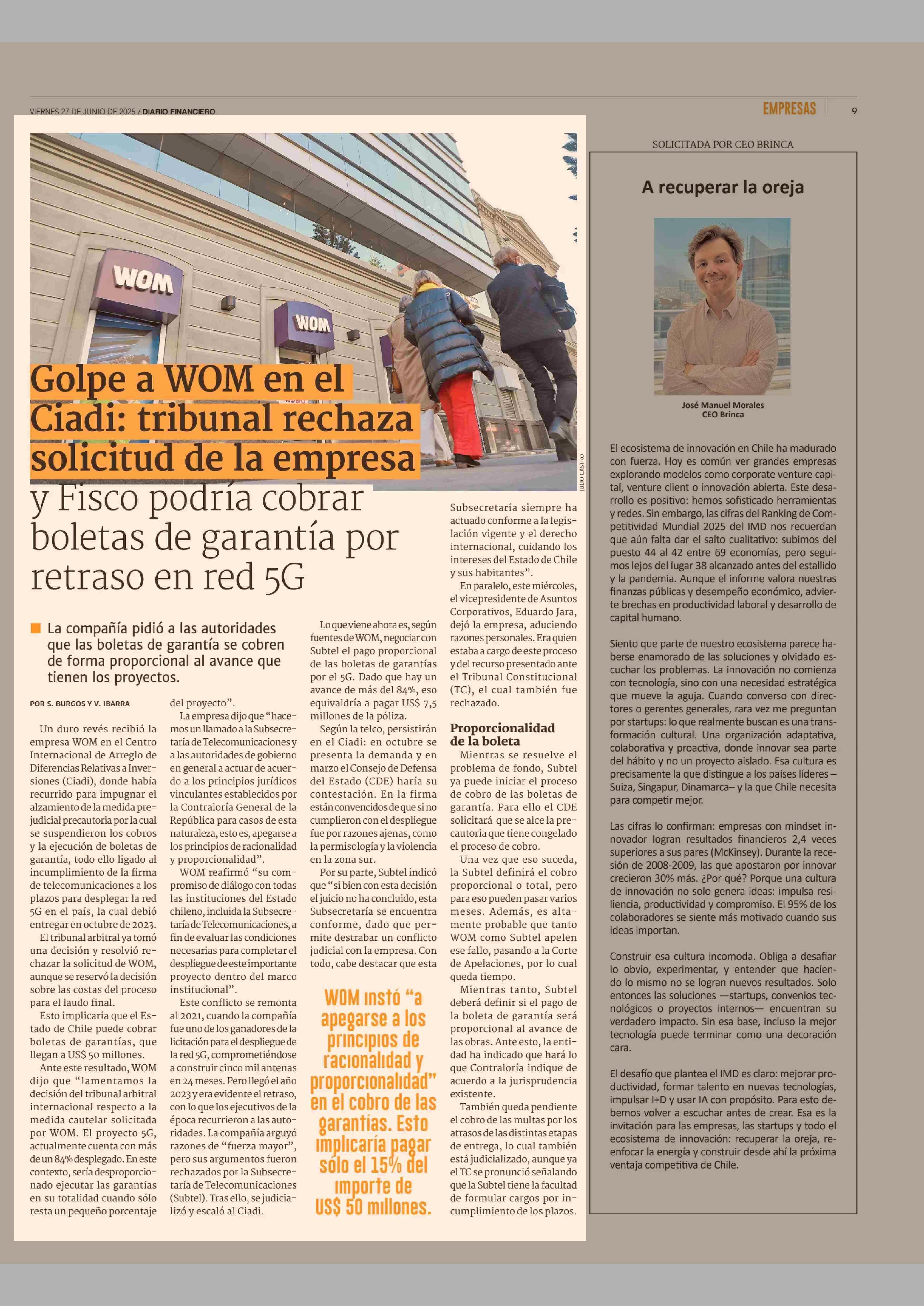 Golpe a WOM en el Ciadi: tribunal rechaza solicitud de la empresa y Fisco podria cobrar boletas de garantía por retraso en red 5G 27-06-2025 Diario Financiero |