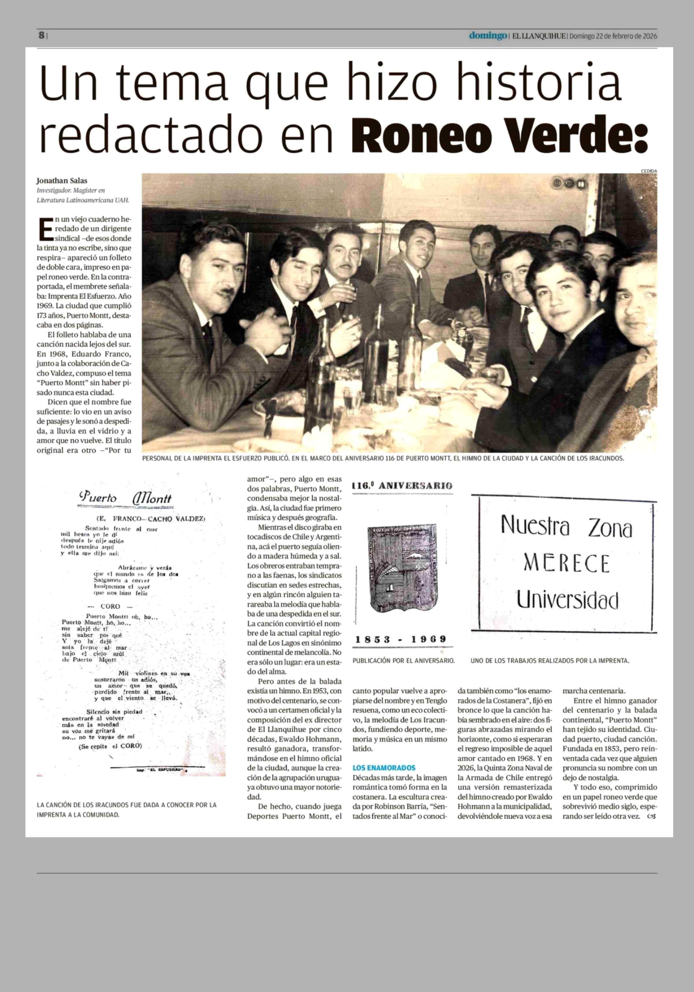 Un tema que hizo historia redactado en Roneo Verde: 22-02-2026 El Llanquihue |