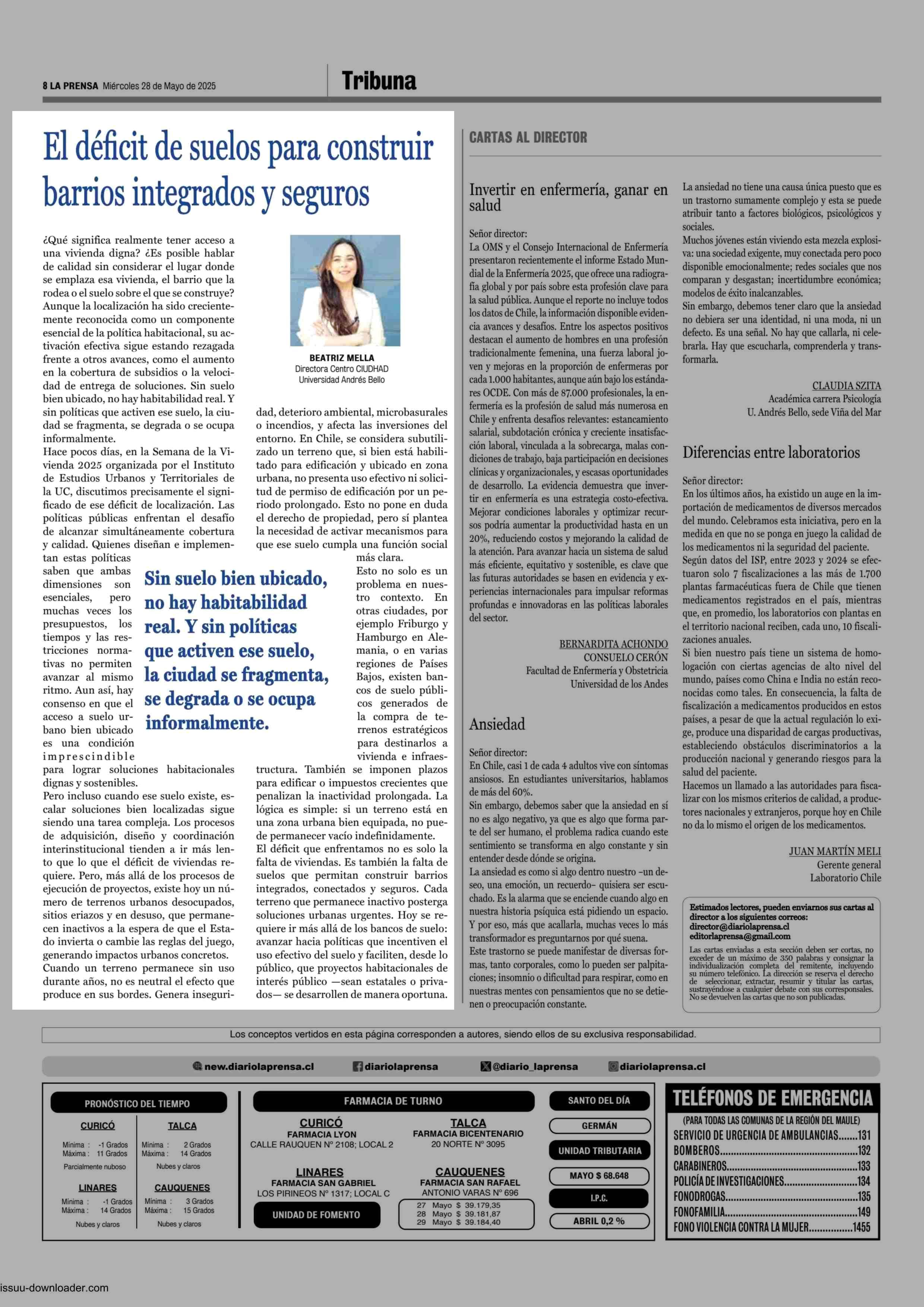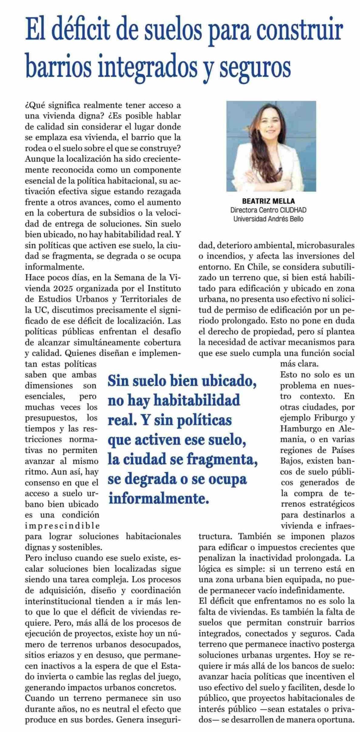 COLUMNAS DE OPINIÓN: El déficit de suelos para construir barrios integrados y seguros 28-05-2025 La Prensa de Curicó |