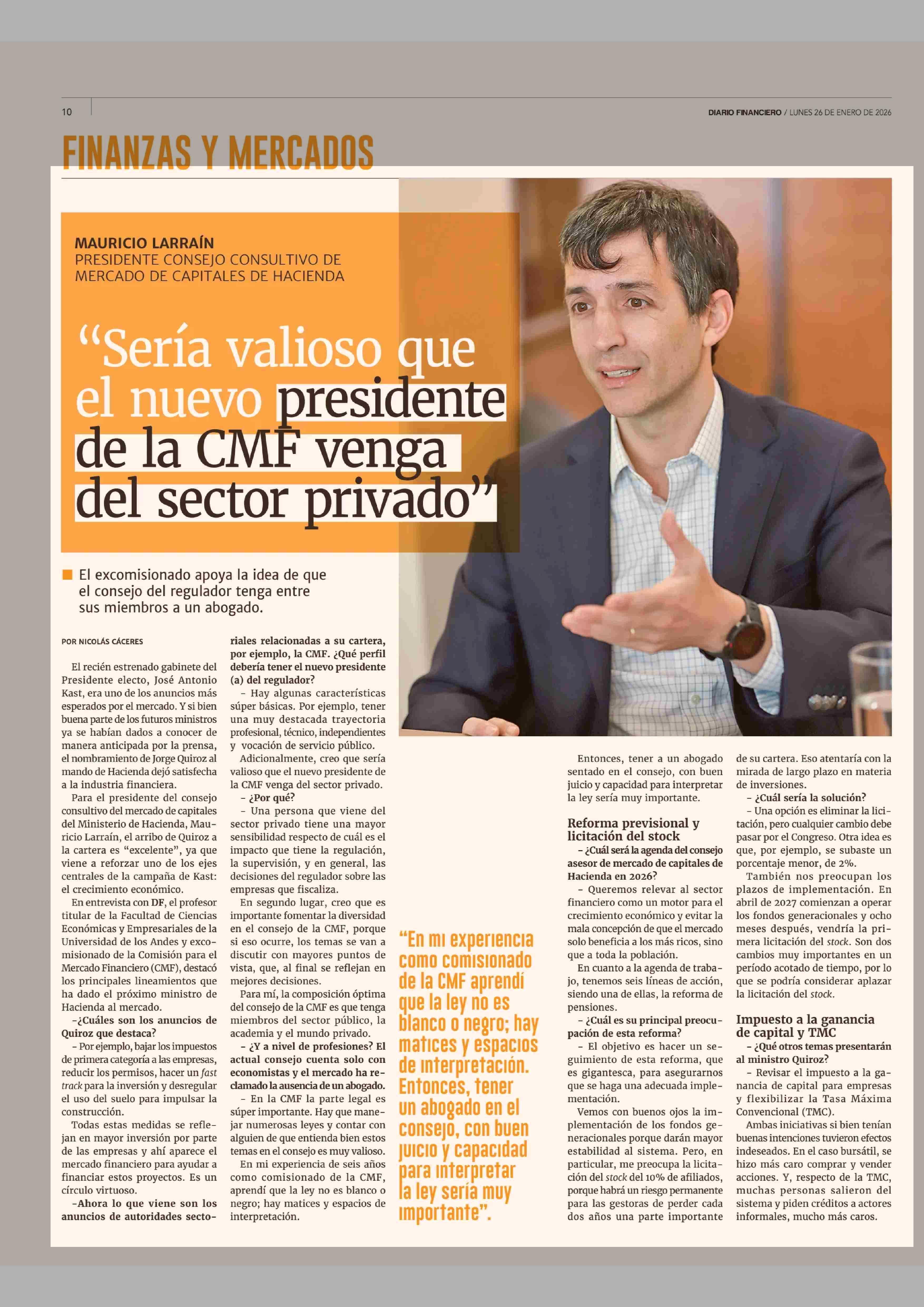 "Sería valioso que el nuevo presidente de la CMF venga del sector privado" 26-01-2026 Diario Financiero |