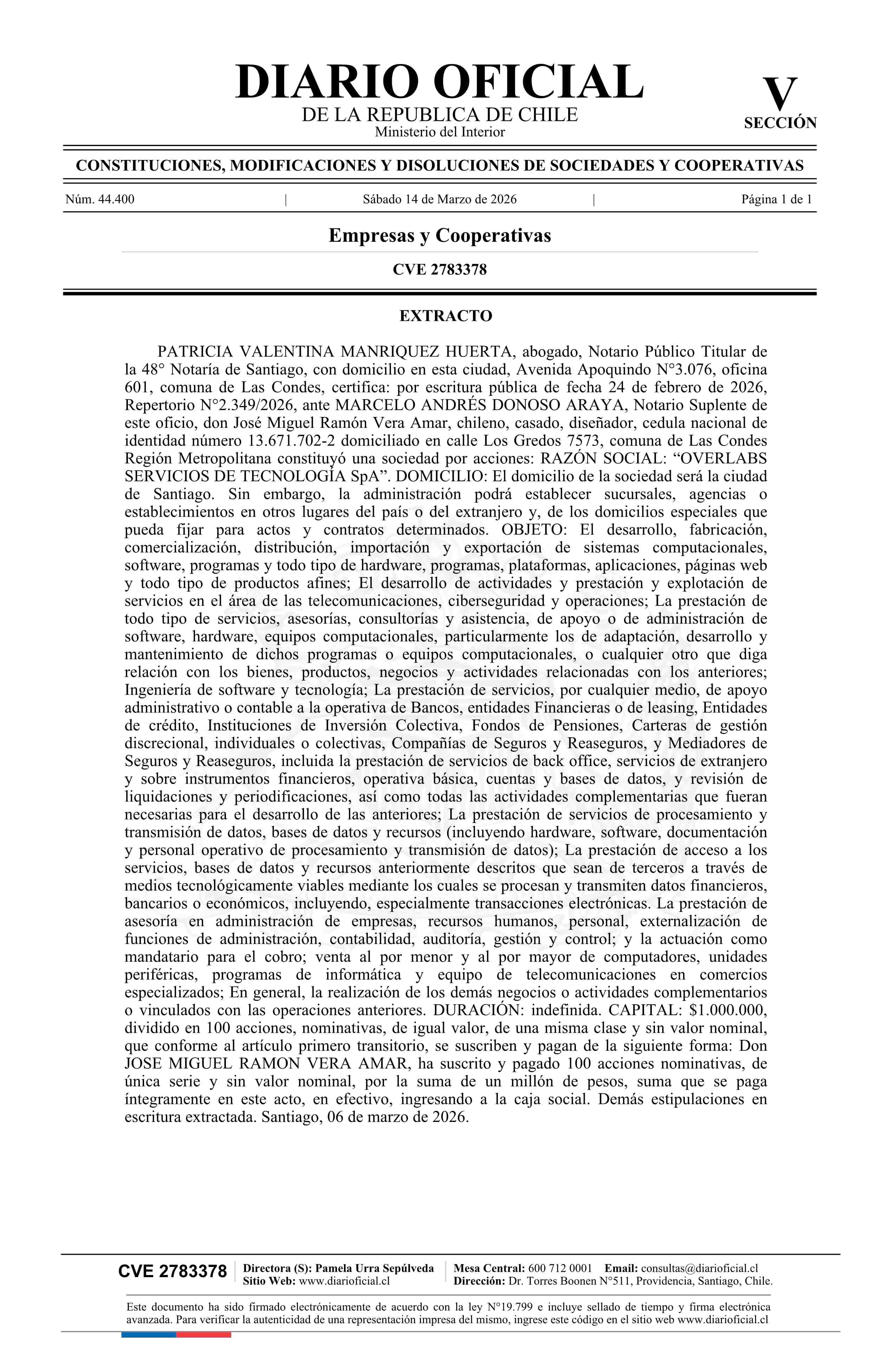 OVERLABS SERVICIOS DE TECNOLOGÍA SpA 14-03-2026 Diario Oficial Edición Electrónica |
