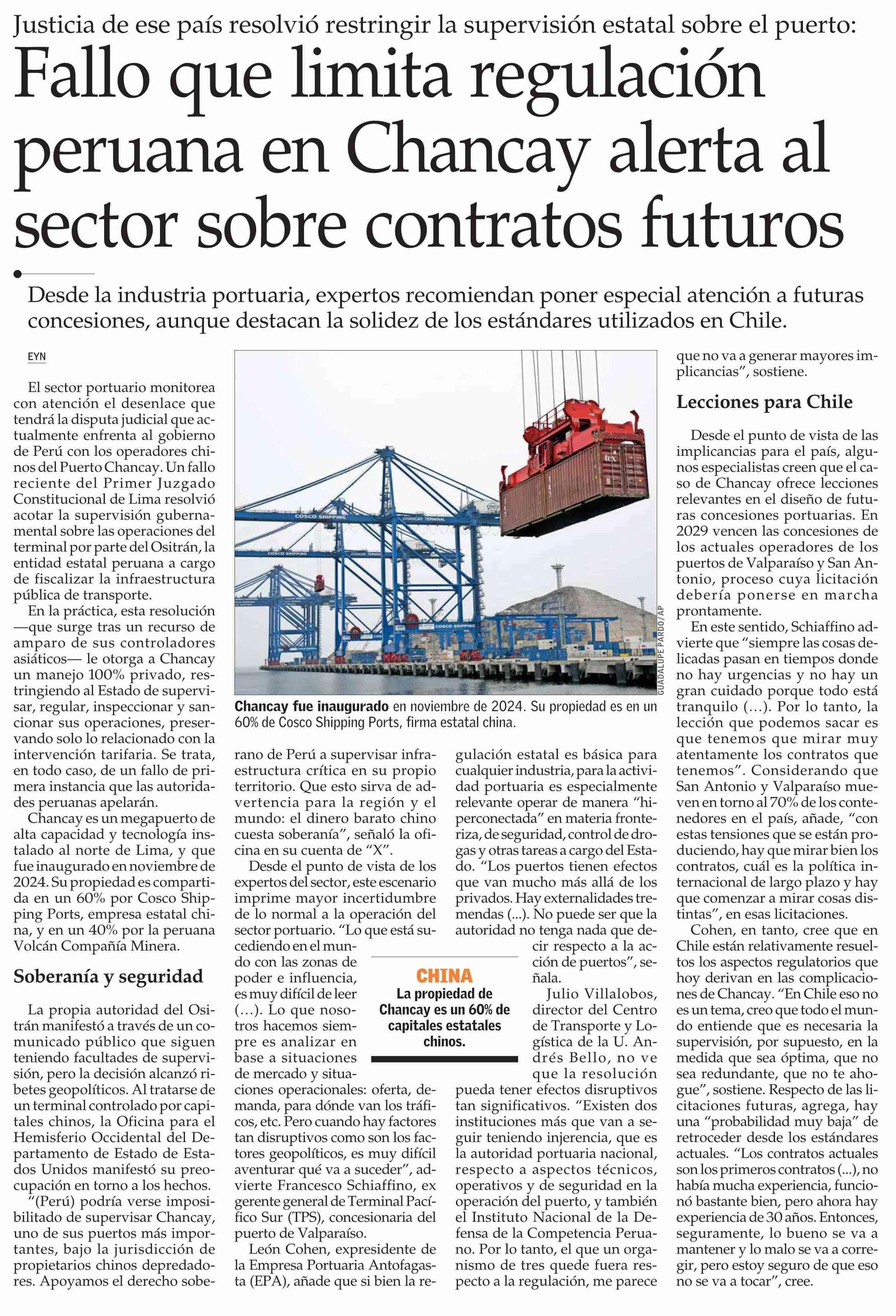 Fallo que limita regulación peruana en Chancay alerta al sector sobre contratos futuros 13-02-2026 El Mercurio |