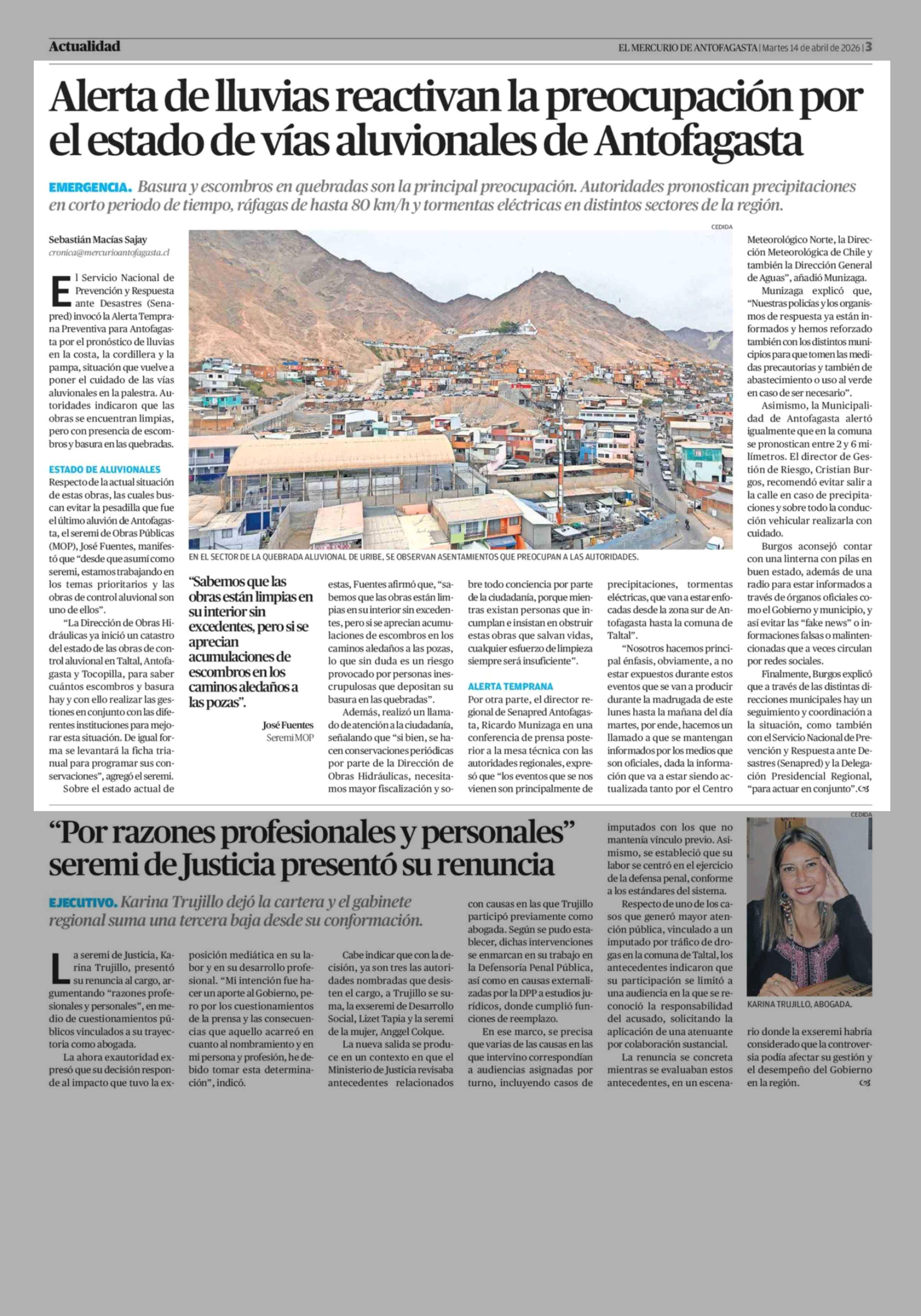 Alerta de lluvias reactivan la preocupación por el estado de vías aluvionales de Antofagasta 14-04-2026 El Mercurio de Antofagasta |