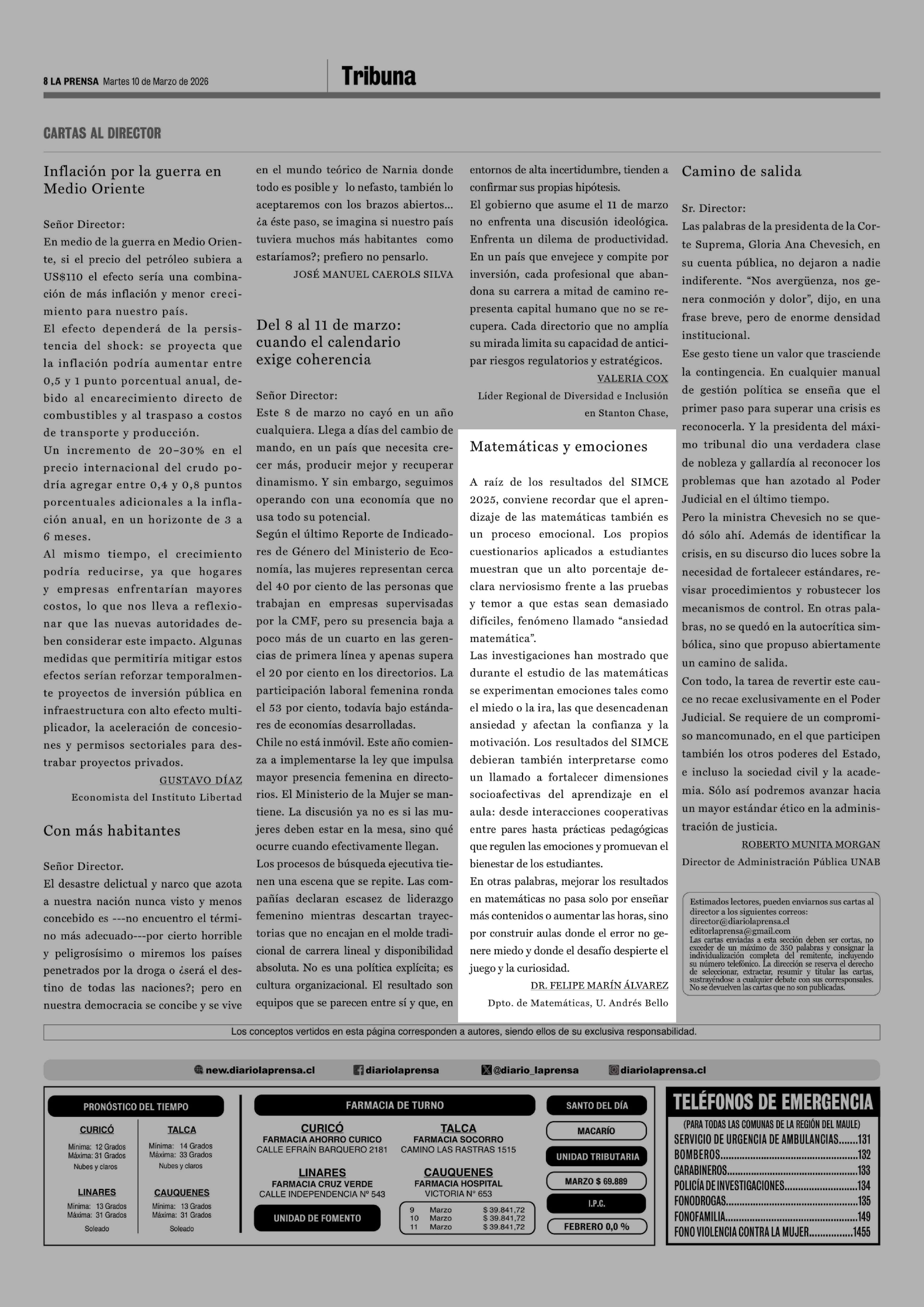 Cartas: Matemáticas y emociones 10-03-2026 La Prensa de Curicó |