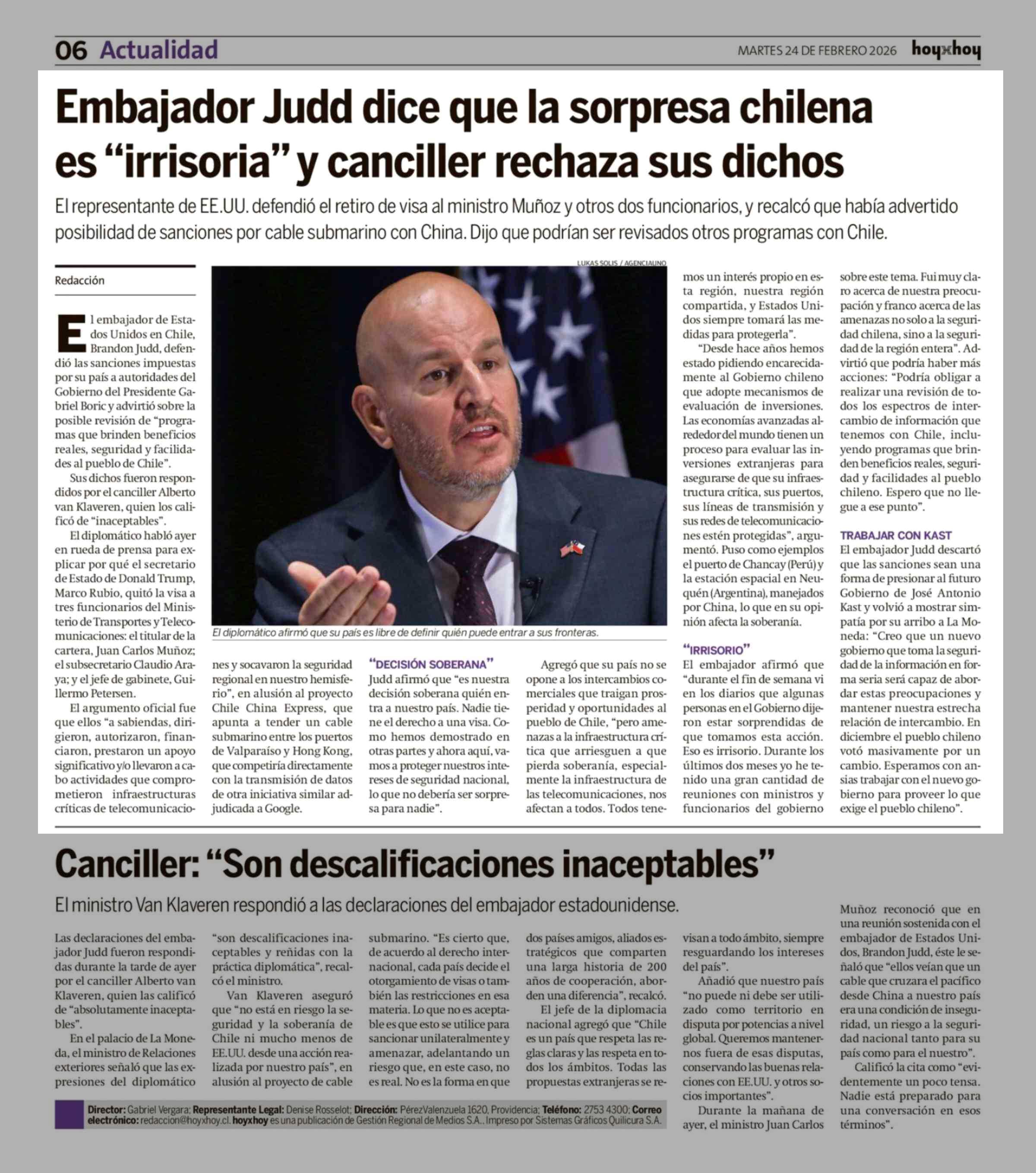Título: Embajador Judd dice que la sorpresa chilena es "irrisoria" y canciller rechaza sus dichos