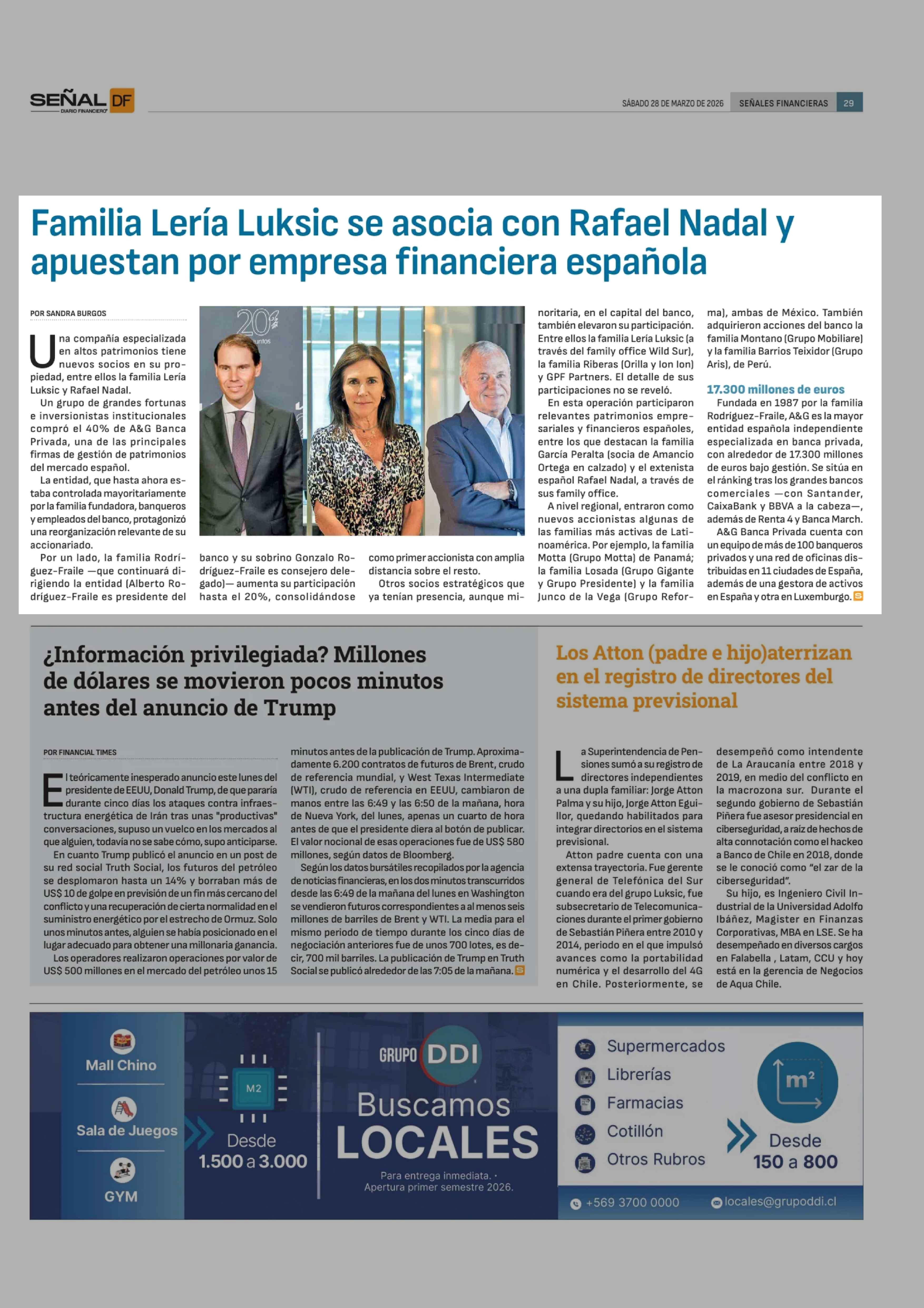 Familia Lería Luksic se asocia con Rafael Nadal y apuestan por empresa financiera española 28-03-2026 Diario Financiero |