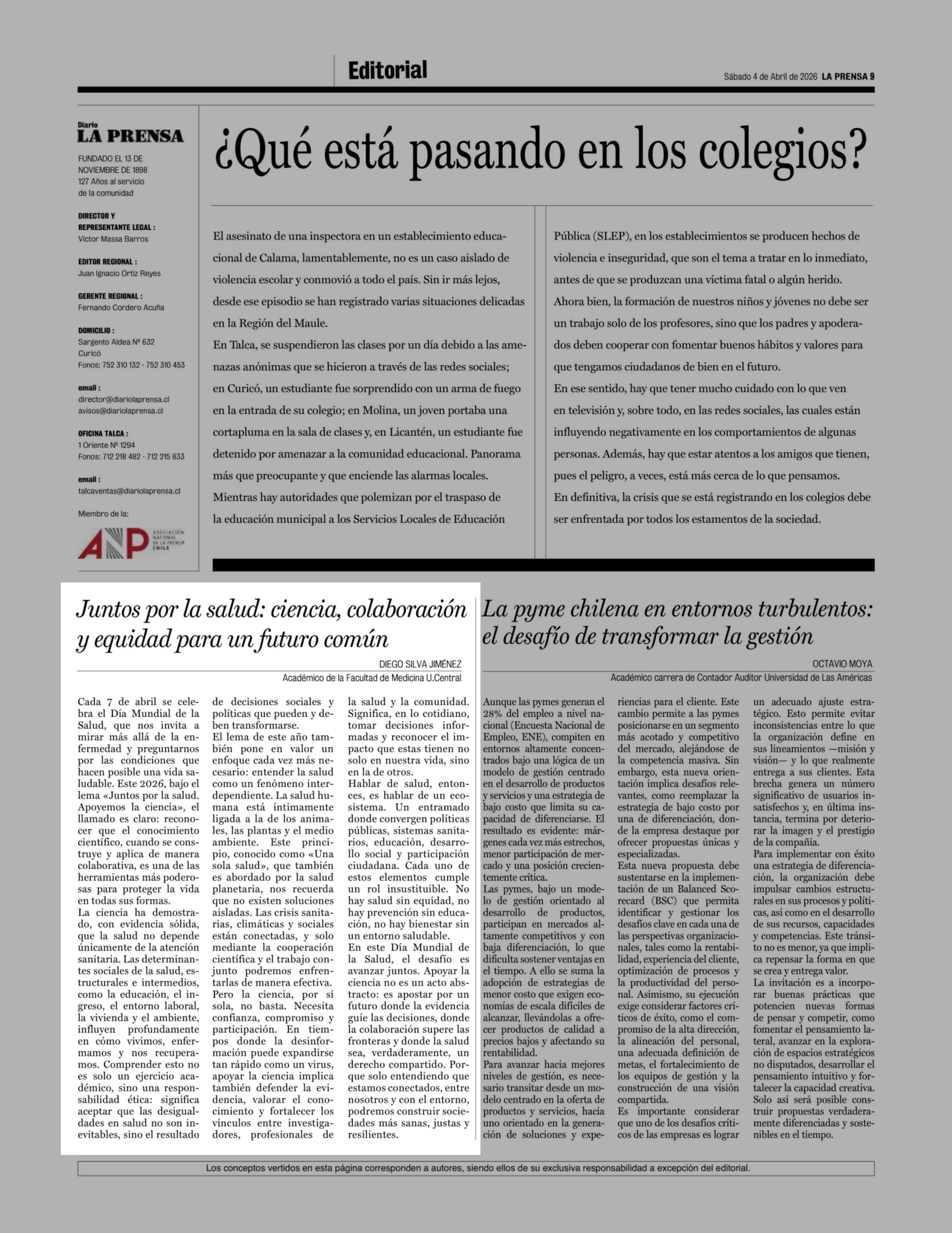 Columnas de Opinión: Juntos por la salud: ciencia, colaboración y equidad para un futuro común 04-04-2026 La Prensa de Curicó |