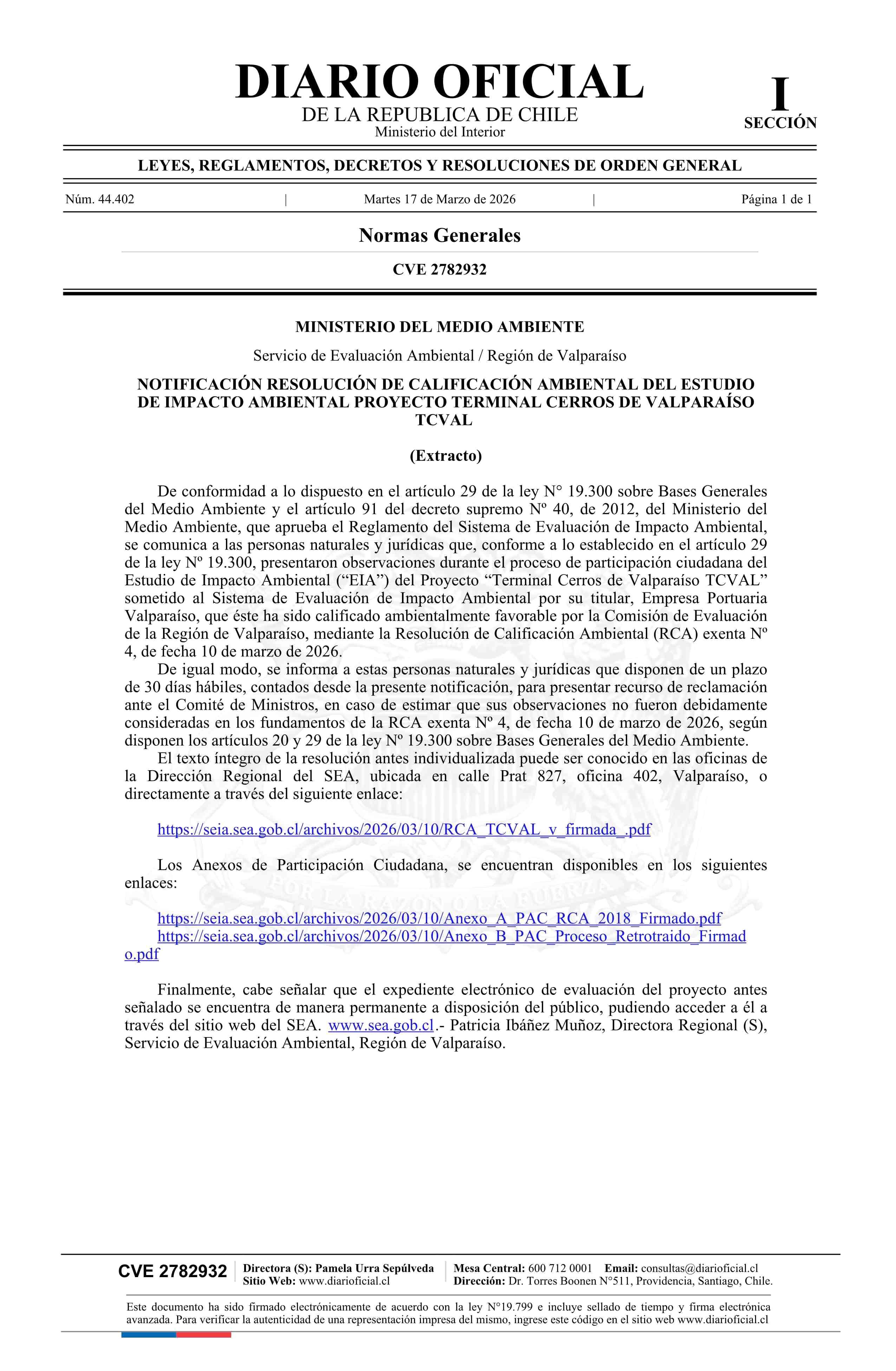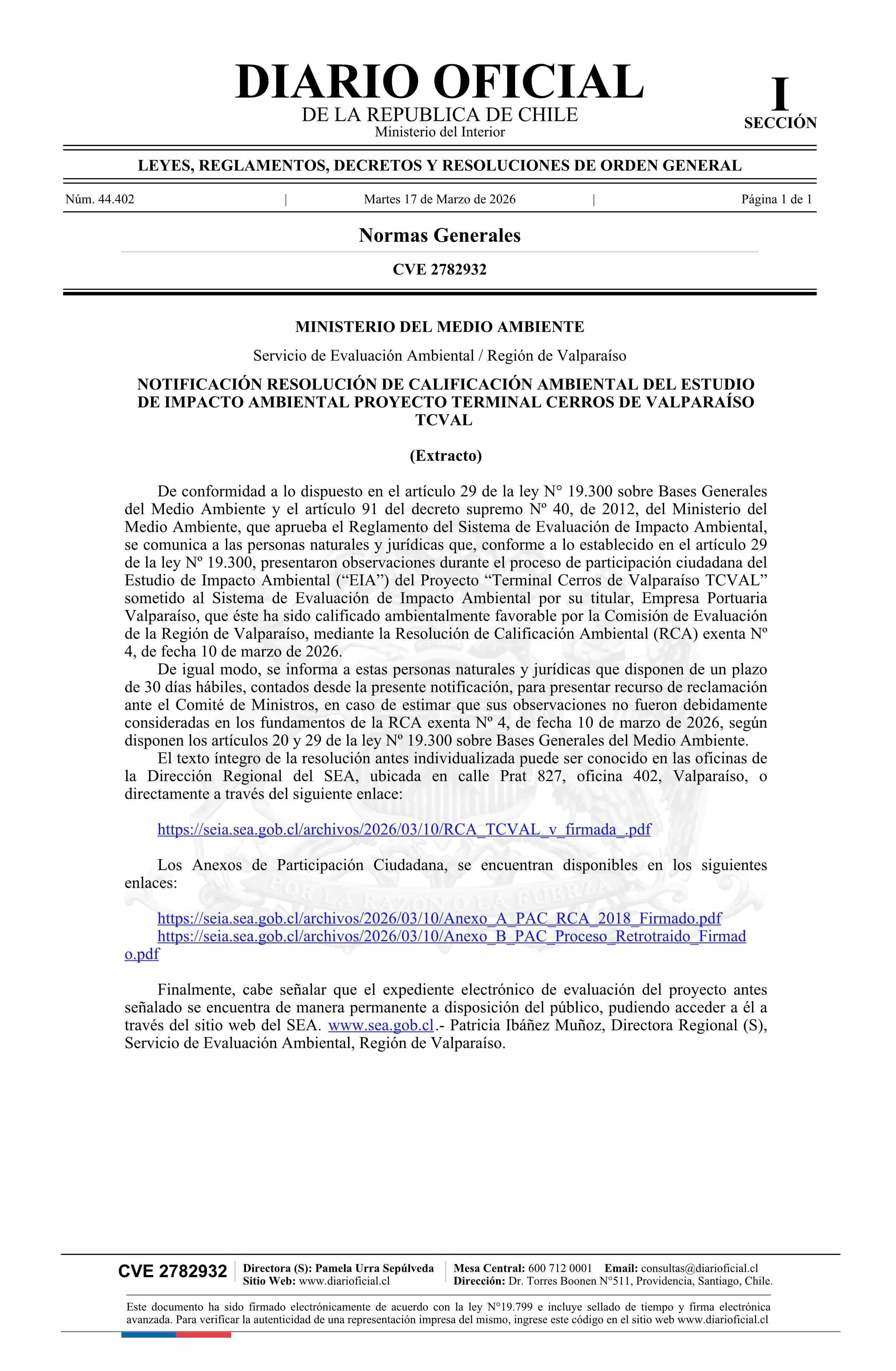 Título: Extracto de resolución exenta número 4, de 2026.- Notifica Resolución de Calificación Ambiental del Estudio de Impacto Ambiental del proyecto Terminal Cerros de Valparaíso TCVAL