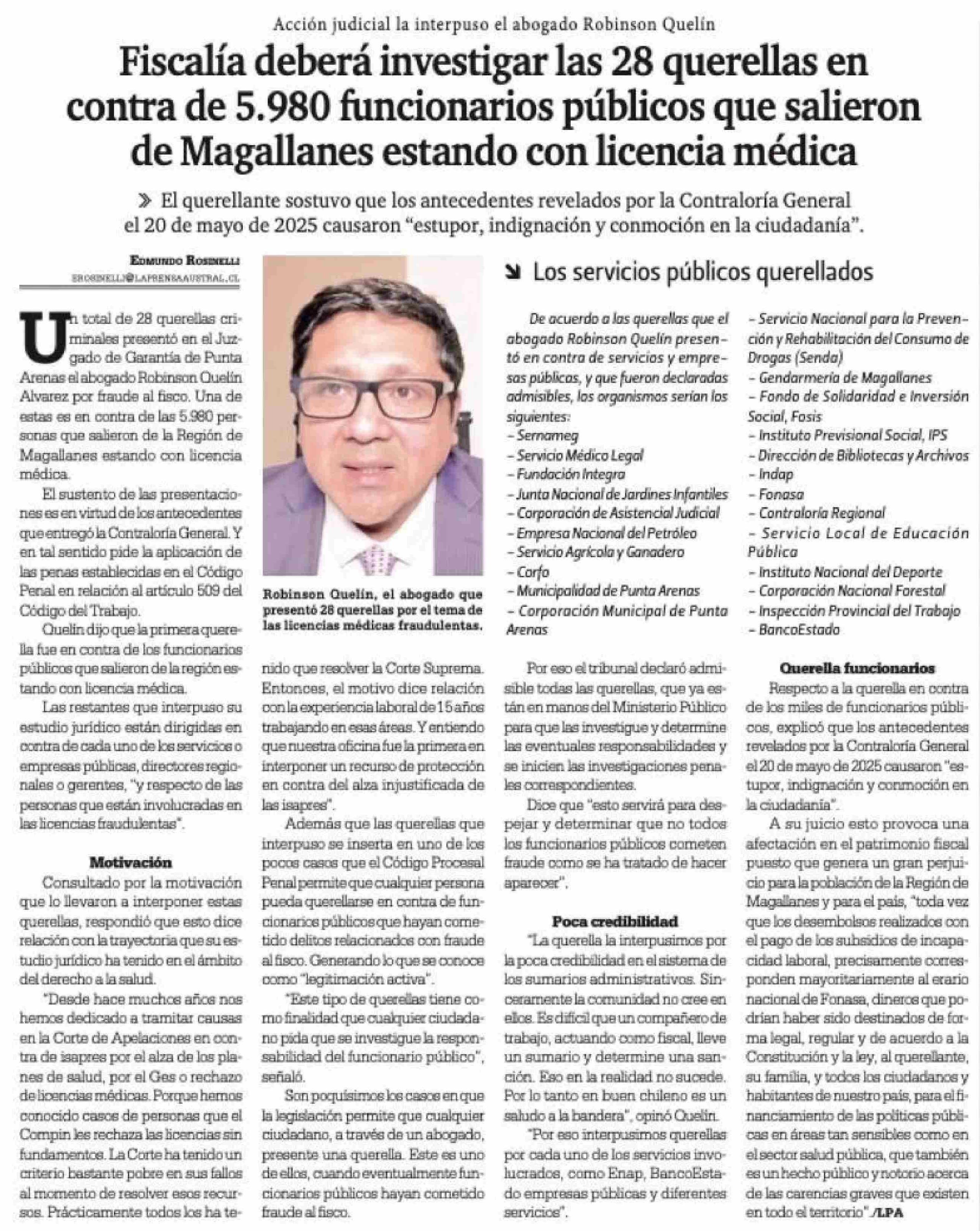 Fiscalía deberá investigar las 28 querellas en contra de 5.980 funcionarios públicos que salieron de Magallanes estando con licencia médica 30-05-2025 La Prensa Austral |