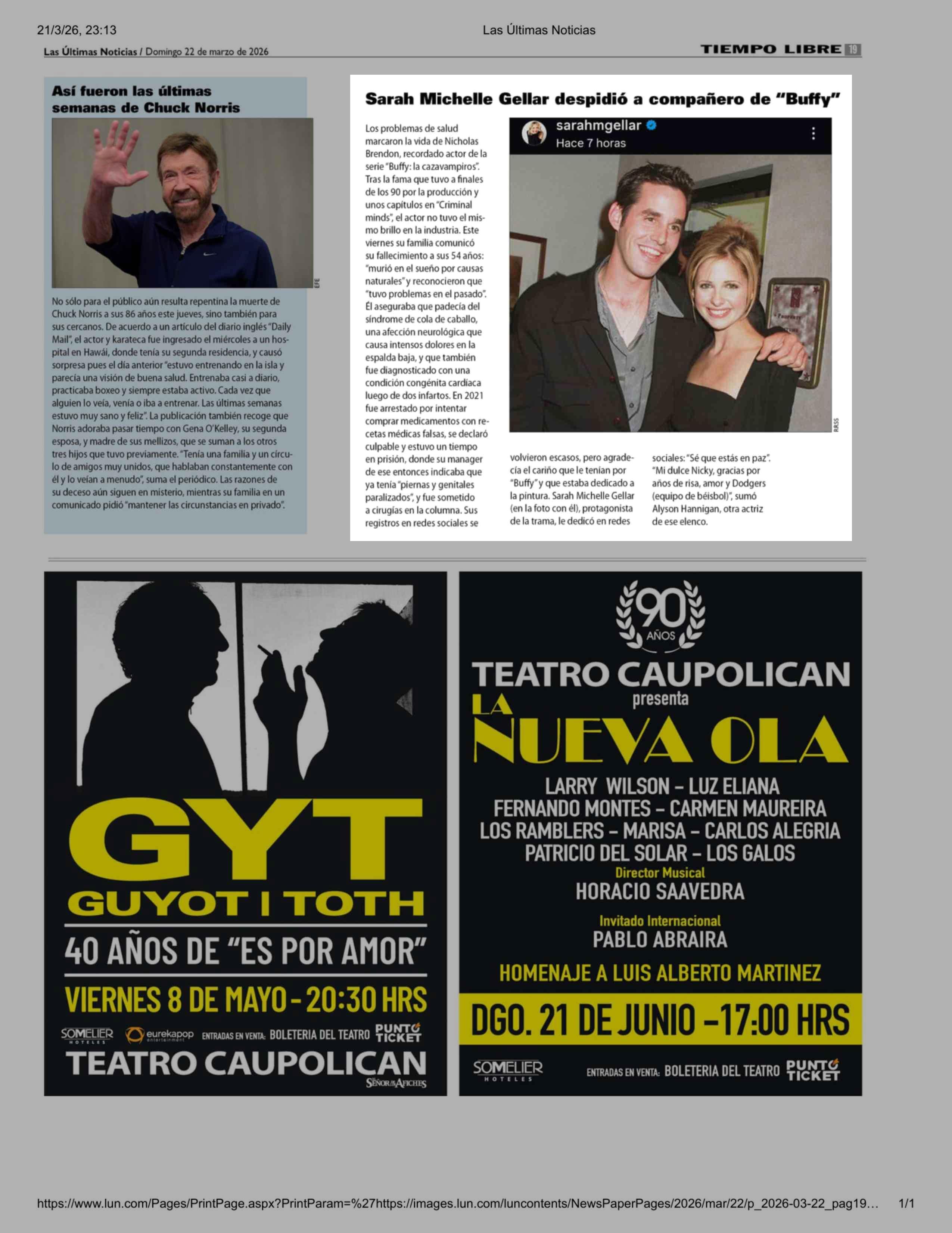 Sarah Michelle Gellar despidió a compañero de "Buffy" 22-03-2026 Las Últimas Noticias |