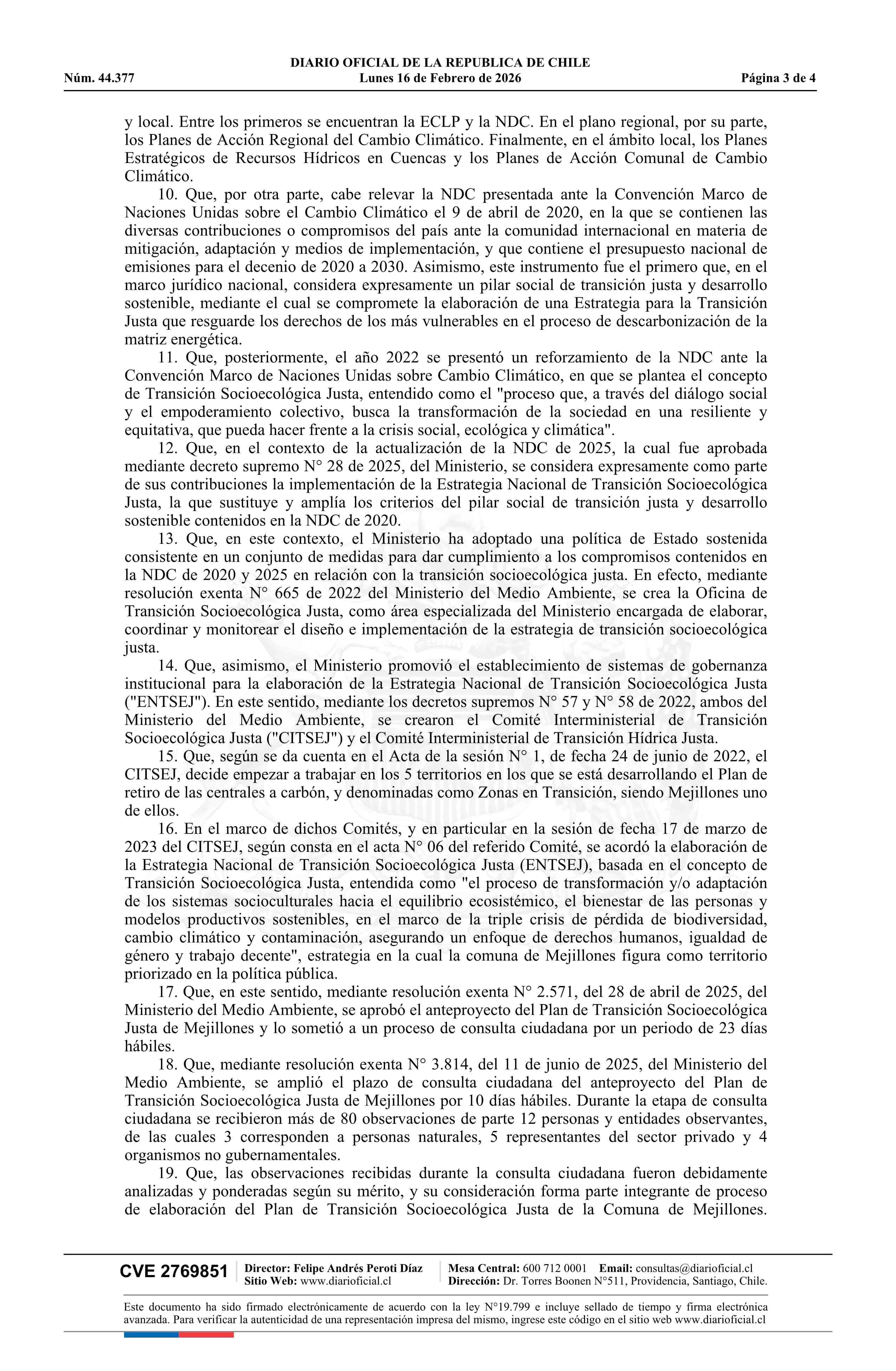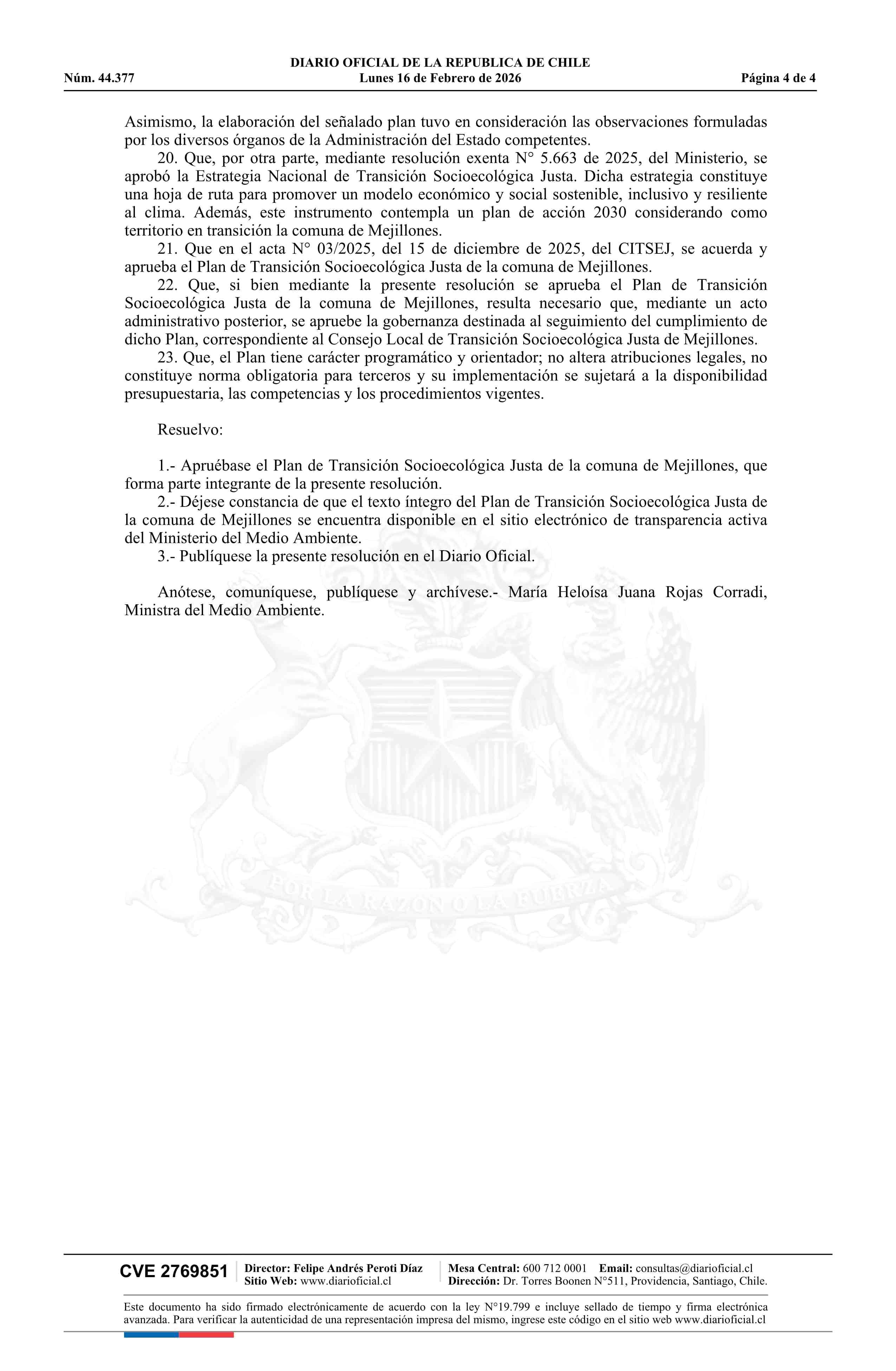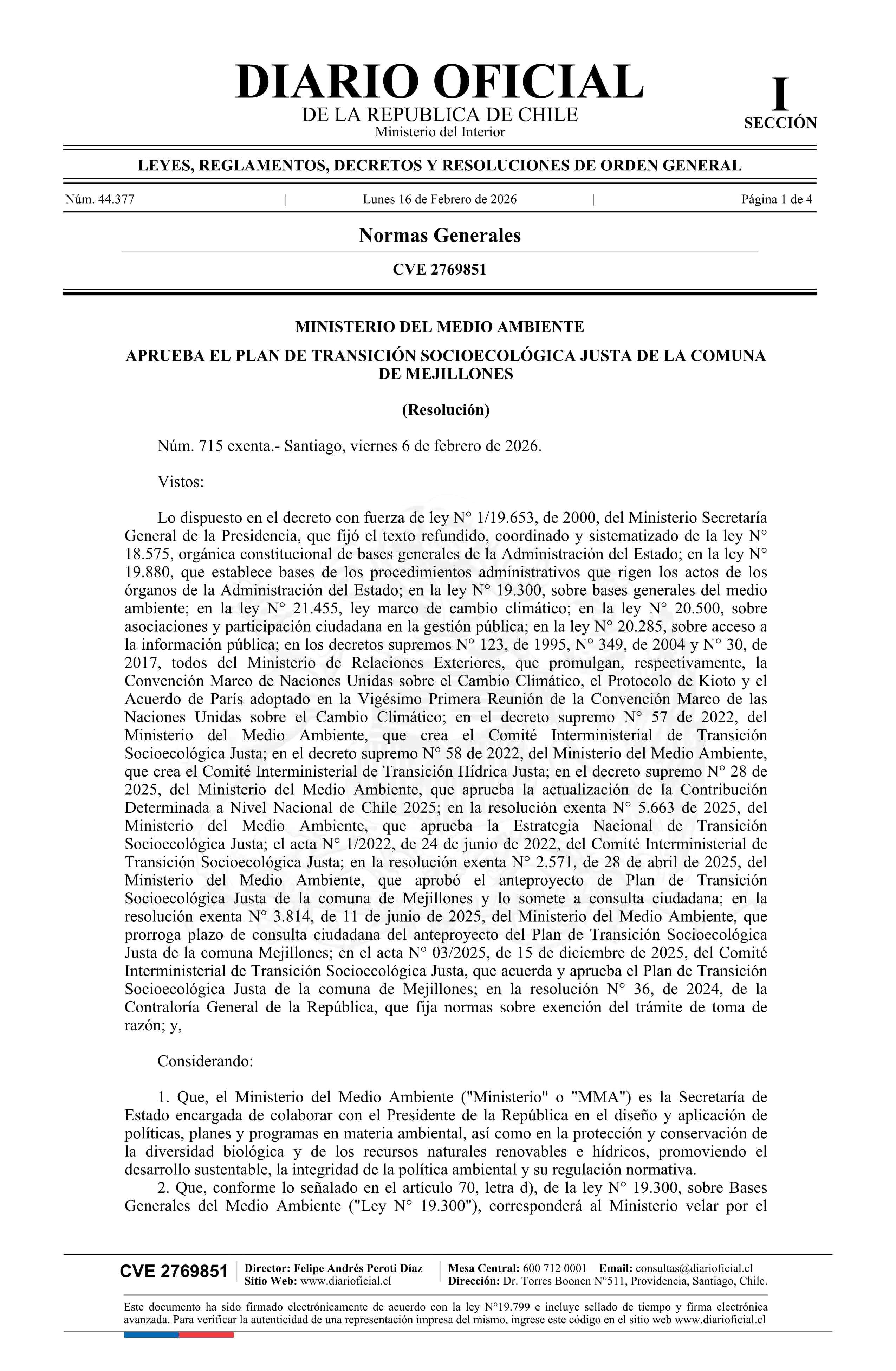 Resolución exenta número 715, de 2026.- Aprueba el Plan de Transición Socioecológica Justa de la Comuna de Mejillones 16-02-2026 Diario Oficial Edición Electrónica |